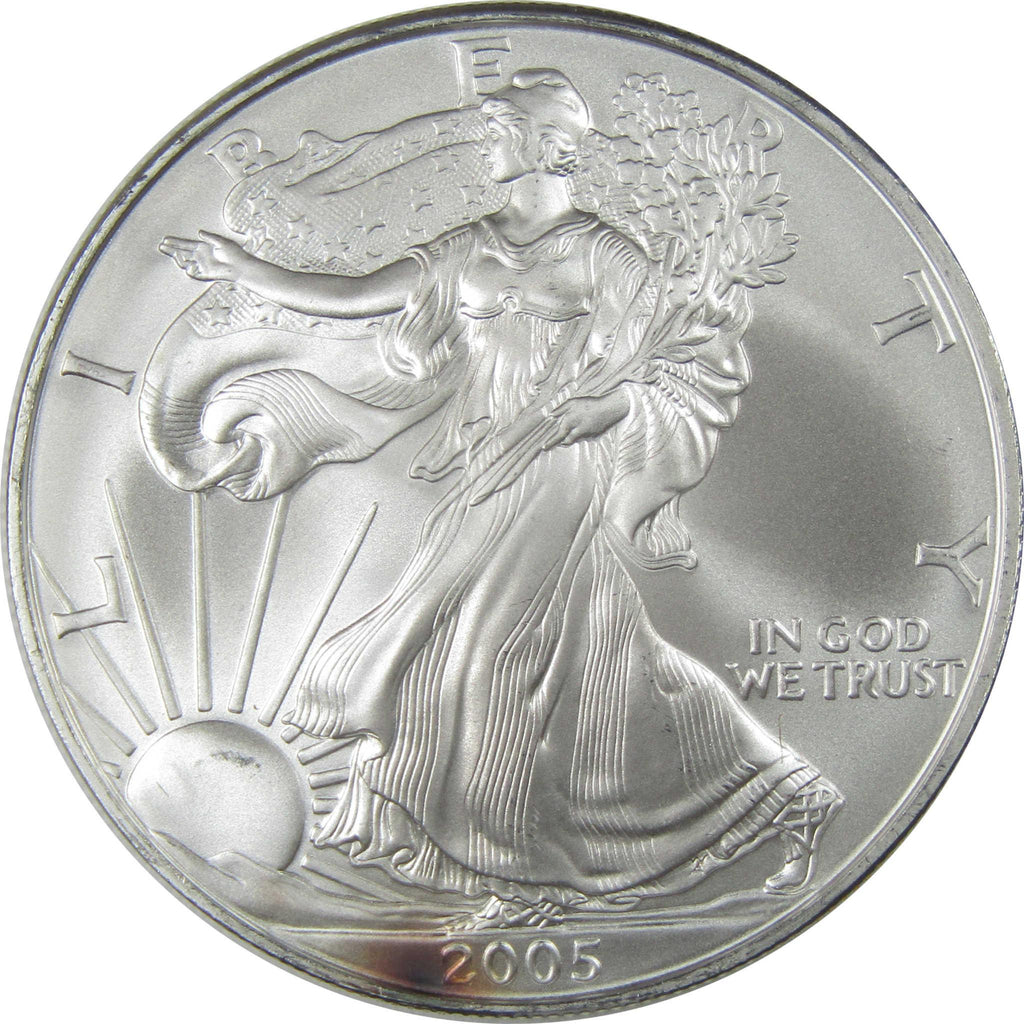 A genuine 2005 American Eagle Silver Dollar Bullion Coin, in Uncirculated Mint State Condition. Contains 1 oz 0.999 Silver. Toned