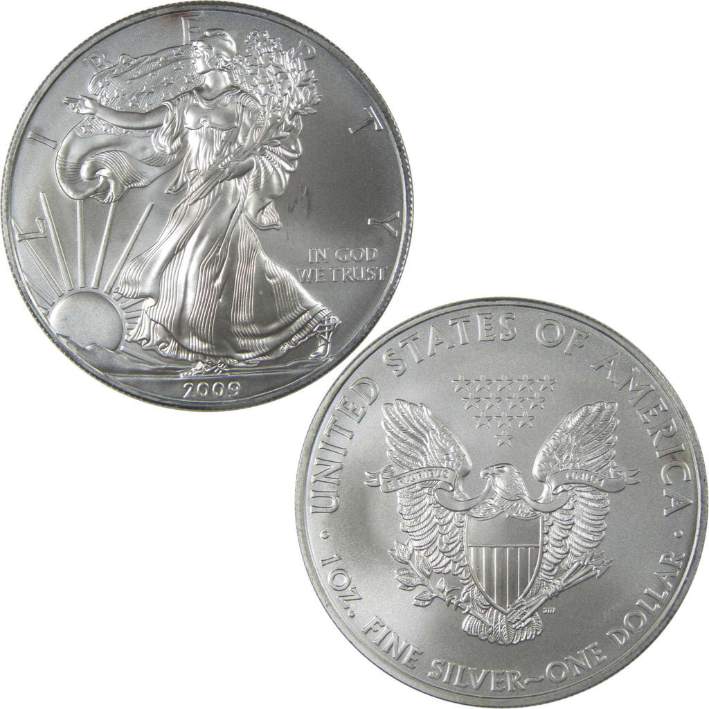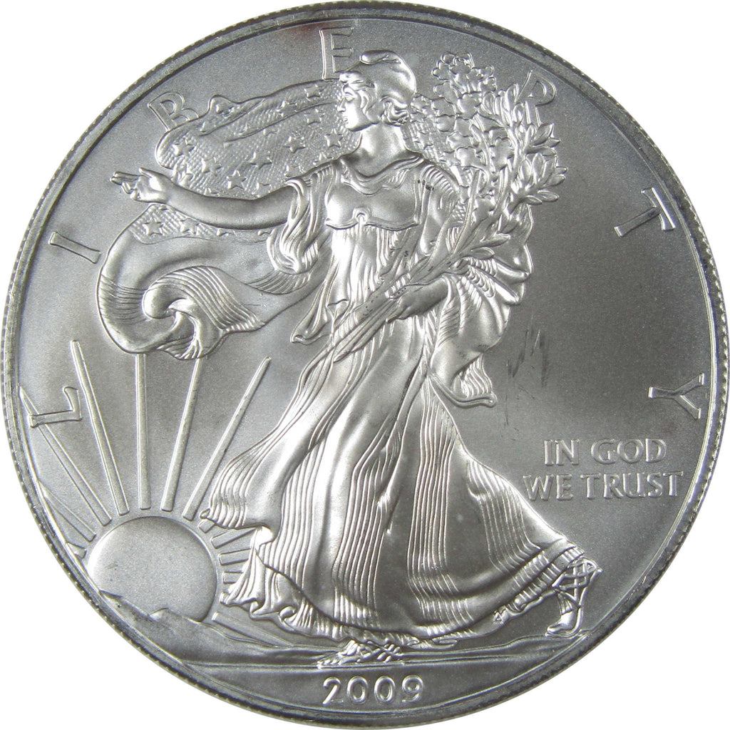 A genuine 2009 American Eagle Silver Dollar Bullion Coin, in Uncirculated Mint State Condition. Contains 1 oz 0.999 Silver. Toned