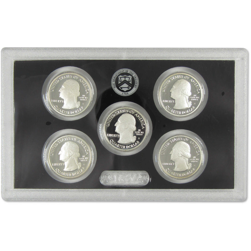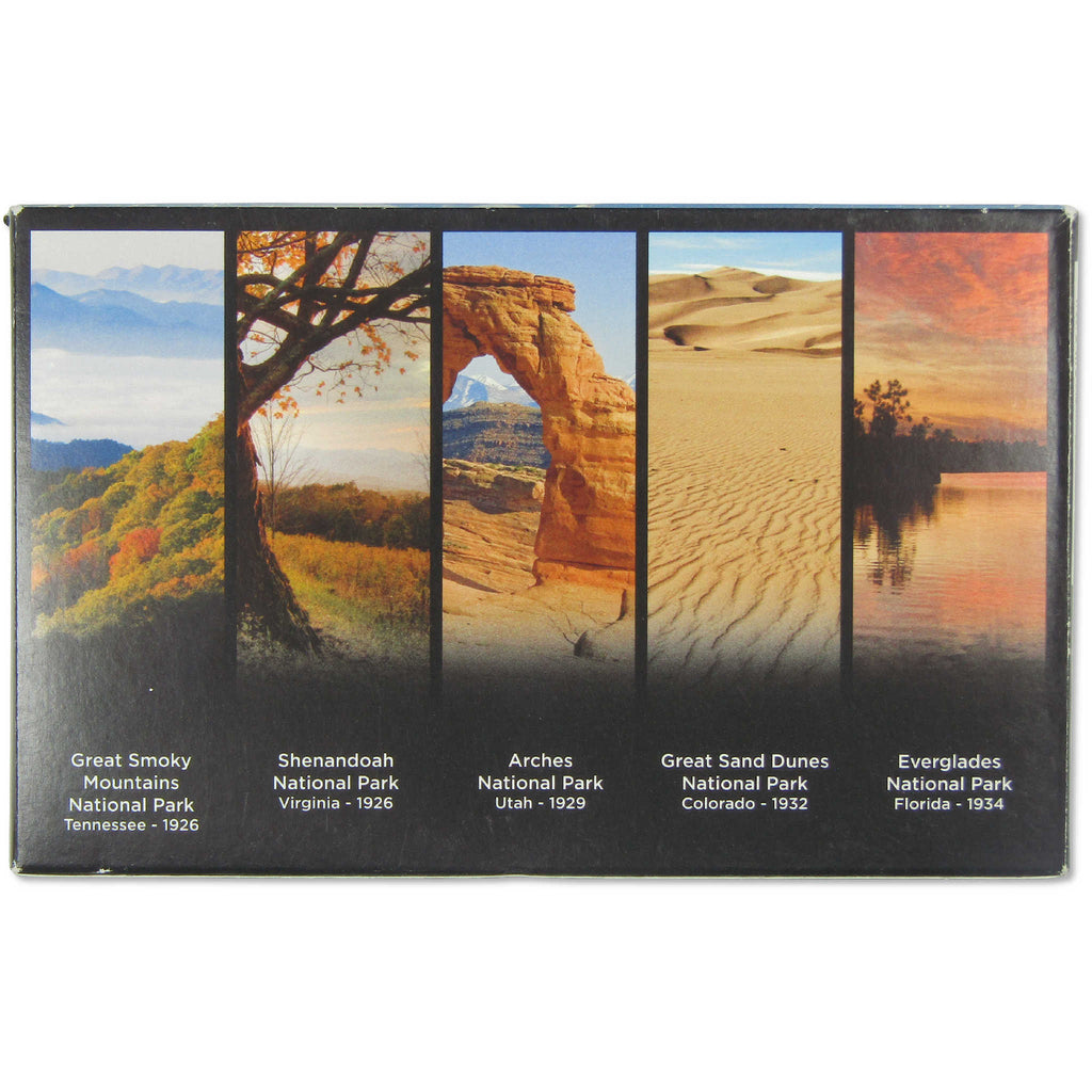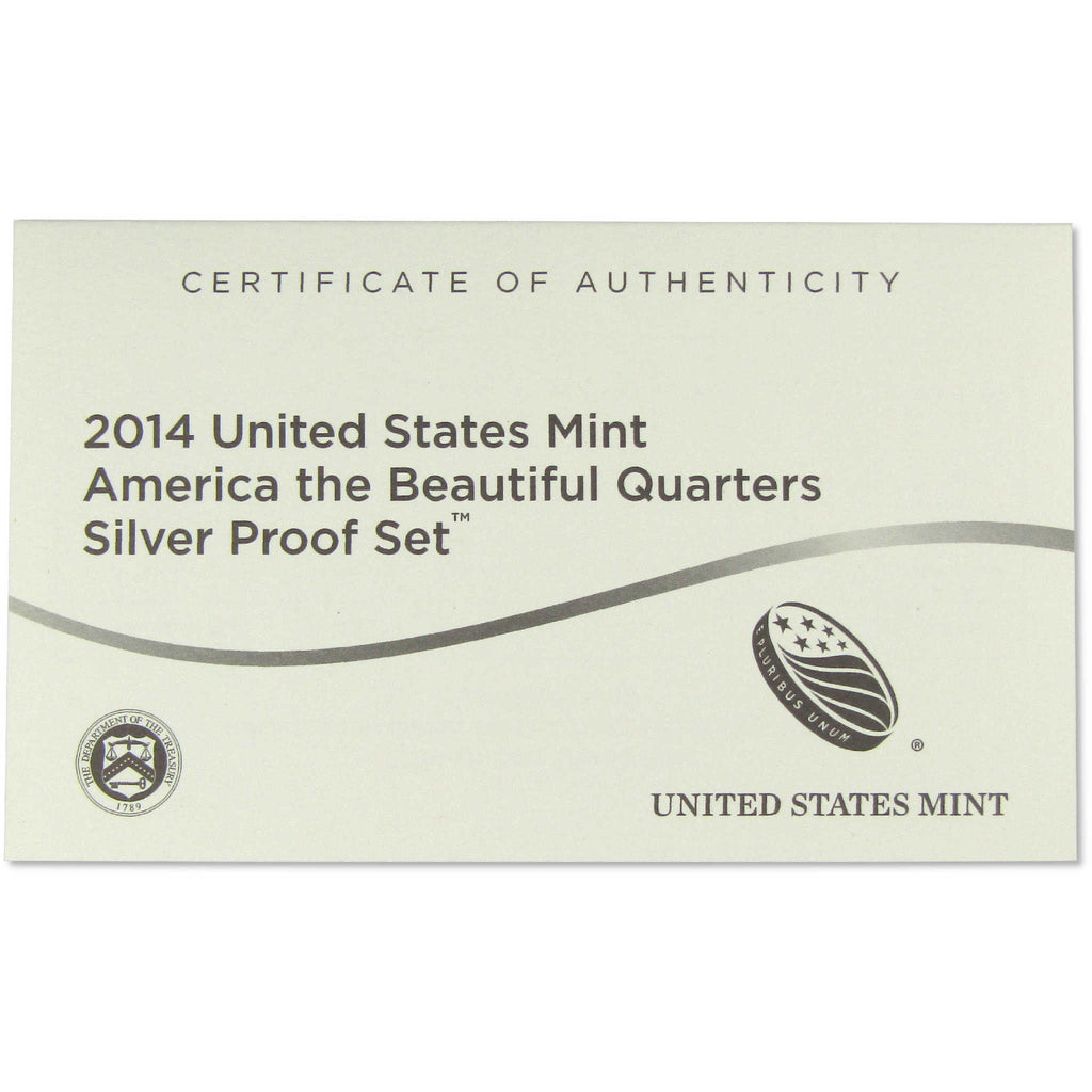This official 2014 U.S. Mint 5 coin America the Beautiful Quarter Silver Proof Set contains all five National Park quarter issues, featuring designs honoring Great Smoky Mountains National Park in Tennessee, Shenandoah National Park in Virginia, Arches National Park in Utah, Great Sand Dunes National Park in Colorado, and Everglades National Park in Florida. All coins bear the San Francisco "S" mint mark, and feature extra sharp images and mirror-like surfaces. Each coin contains 90% silver. Comes with the original U.S. Mint packaging, including a certificate of authenticity.