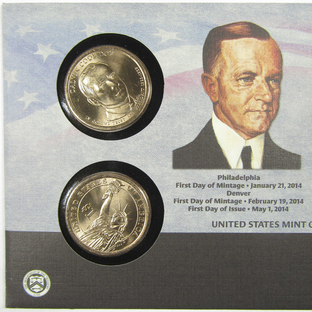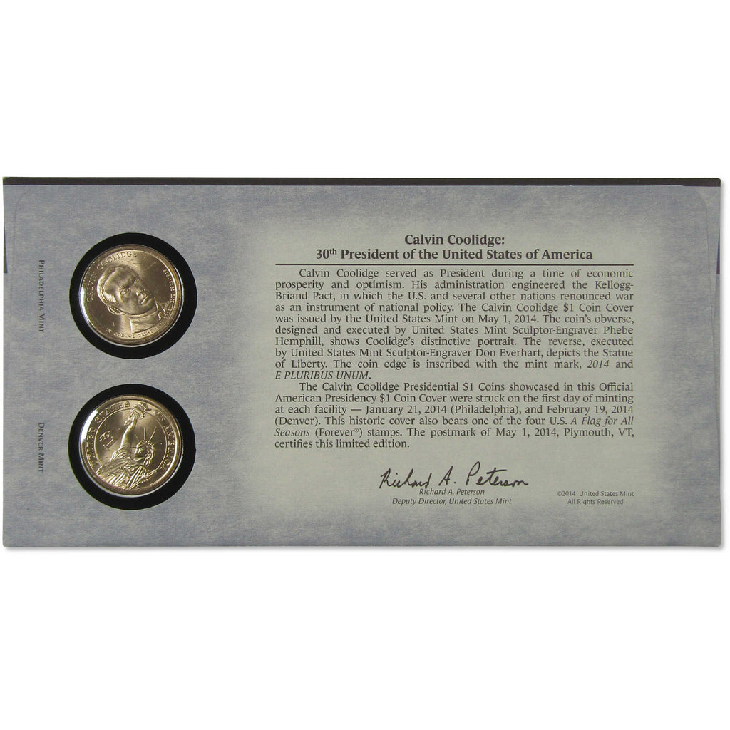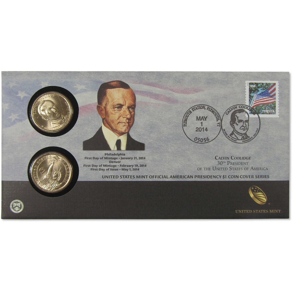 The limited edition 2014 Calvin Coolidge American Presidency $1 Coin Cover is the 30th issue in the American Presidency $1 Coin Cover Series, and includes two circulating quality Calvin Coolidge Presidential $1 Coins from the first day of mintage at the United States Mint Jan. 21, 2014, for the United States Mint at Philadelphia and Feb. 19, 2014, for the United States Mint at Denver. The coins are mounted on a display card and placed inside an envelope bearing A Flag for All Seasons (Forever) stamp. The postmark of "May 1, 2014, Plymouth, VT" marks the date the bureau issued the Calvin Coolidge $1 Coin Cover.