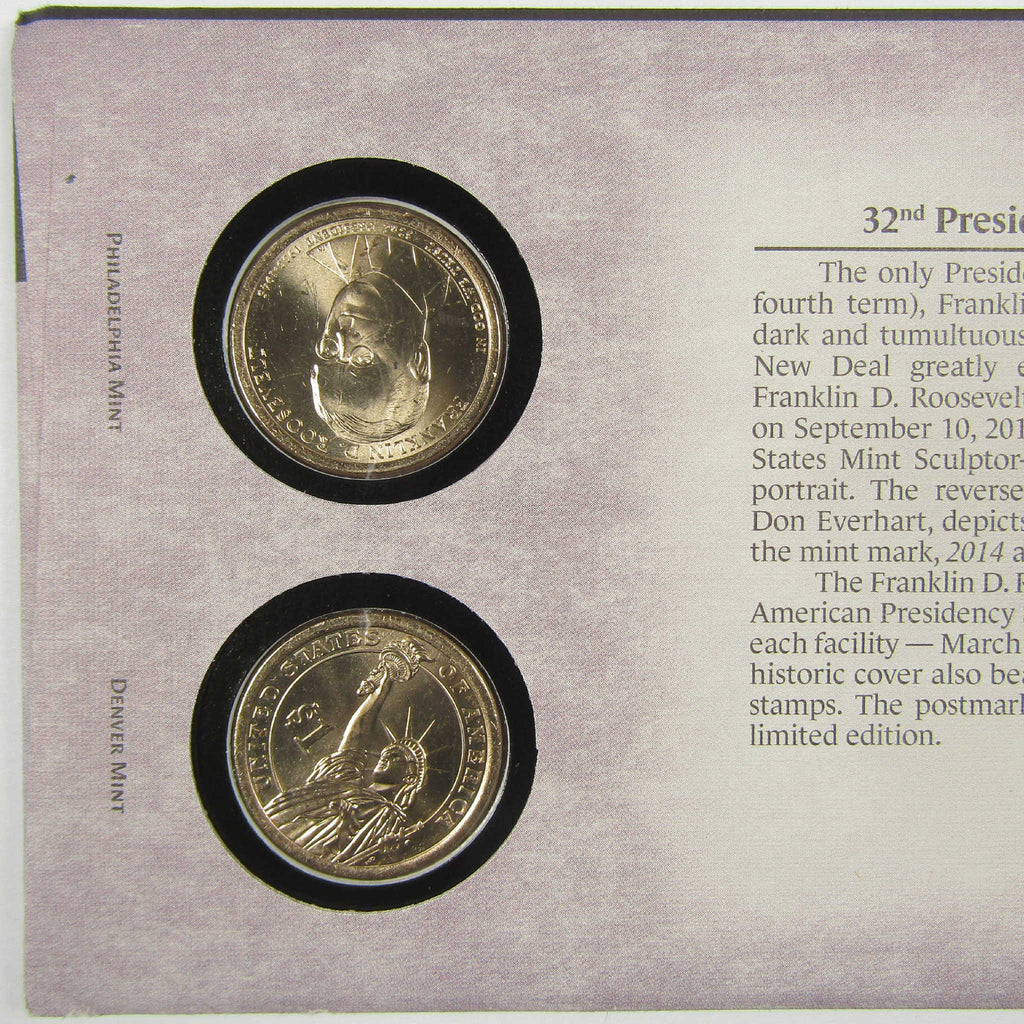 The 2014 Franklin D. Roosevelt American Presidency $1 Coin Cover is the 32nd issue in the American Presidency $1 Coin Cover Series, and includes two circulating quality Franklin D. Roosevelt Presidential $1 Coins from the first day of mintage at the United States Mint March 5, 2014, for the United States Mint at Philadelphia, and April 14, 2014, for the United States Mint at Denver. The coins are mounted on a display card, which is placed inside an envelope bearing A Flag for All Seasons (Forever) stamp. The cover also features a portrait of President Roosevelt and the postmark of September 10, 2014, Hyde Park, NY, which marks the day the Franklin D. Roosevelt $1 Coin Cover was issued by the United States Mint.