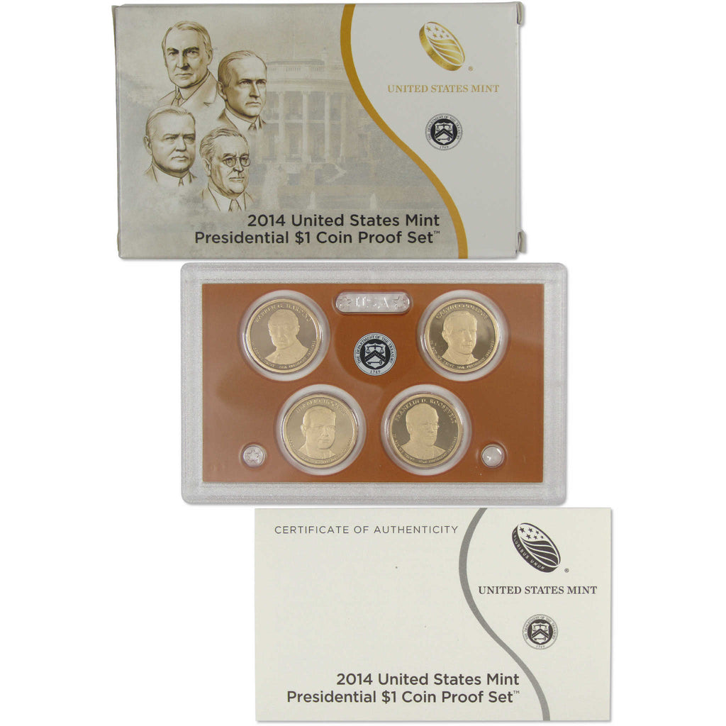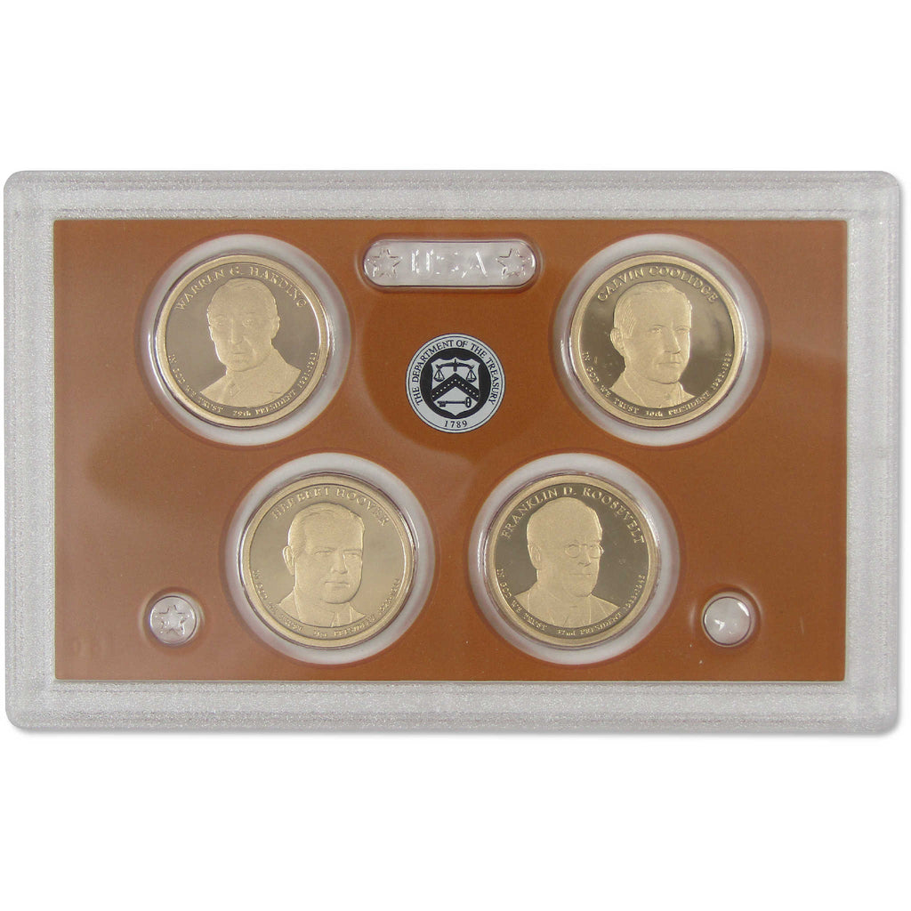 This official 2014 U.S. Mint 4 coin Presidential Dollar Proof Set contains the highest quality 2013 Presidential dollars, all in an official U.S. Mint holder. Honoring former presidents Warren G. Harding, Calvin Coolidge, Herbert Hoover, and Franklin D. Roosevelt, these proof coins feature sharp frosted images against brilliant mirror-like surfaces. Comes with the original U.S. Mint packaging, including a certificate of authenticity.