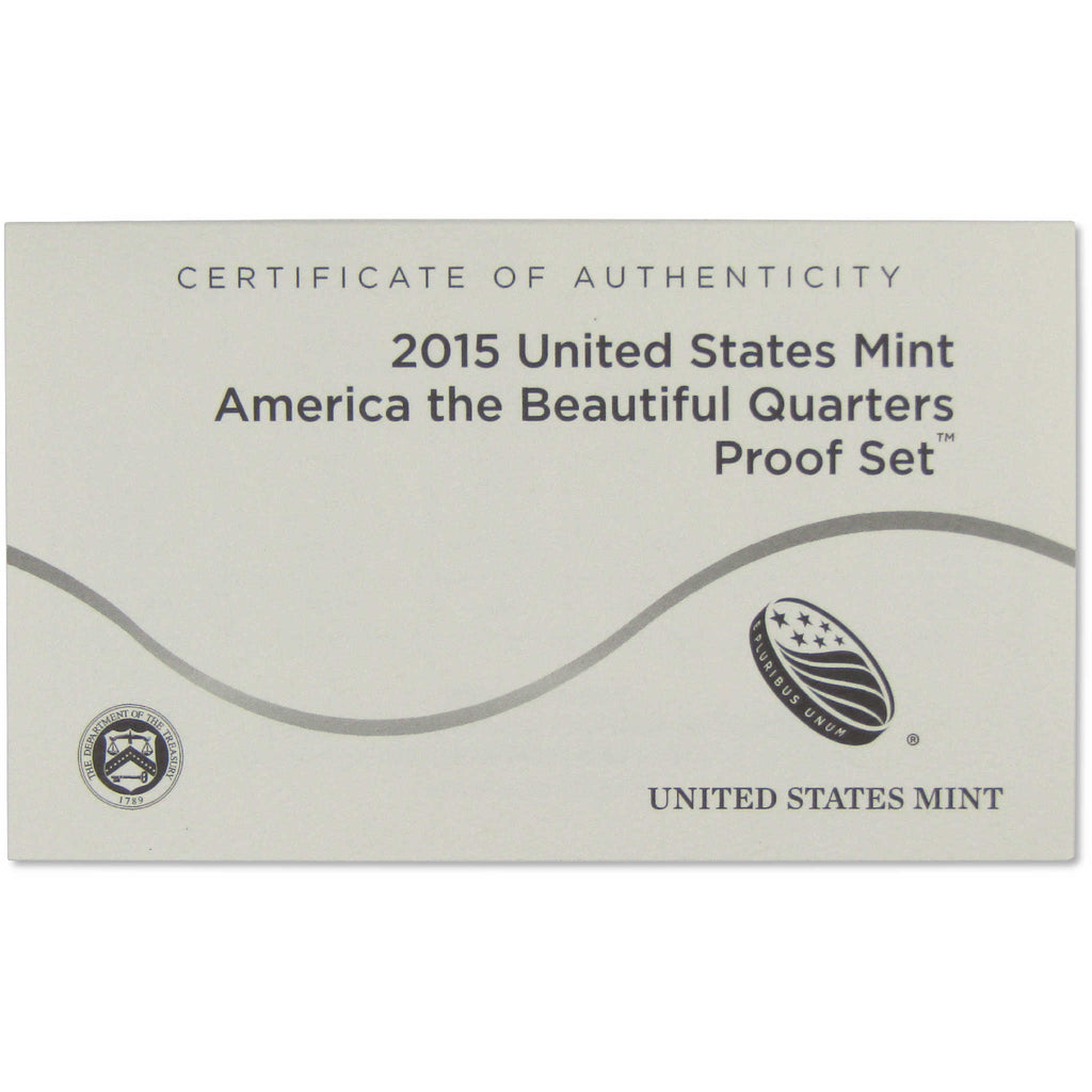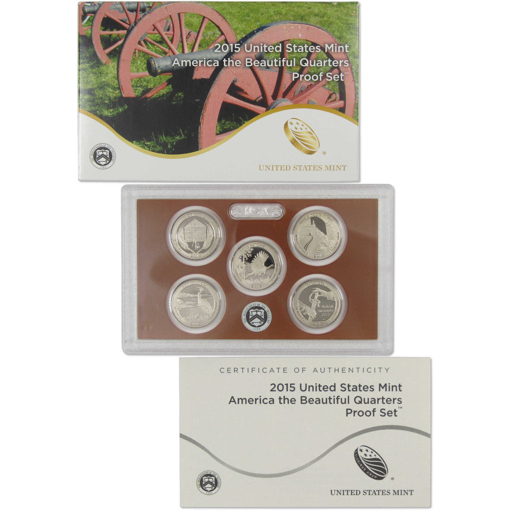This official 2015 U.S. Mint 5 coin America the Beautiful Quarter Proof Set contains all five National Park quarter issues, featuring designs honoring Homestead National Monument of America in Nebraska, Kisatchie National Forest in Louisiana, Blue Ridge Parkway in North Carolina, Bombay Hook National Wildlife Refuge in Delaware, and Saratoga National Historical Park in New York. All coins bear the San Francisco "S" mint mark, and feature extra sharp images and mirror-like surfaces. The coins are all copper-nickel clad. Comes with the original U.S. Mint packaging, including a certificate of authenticity.