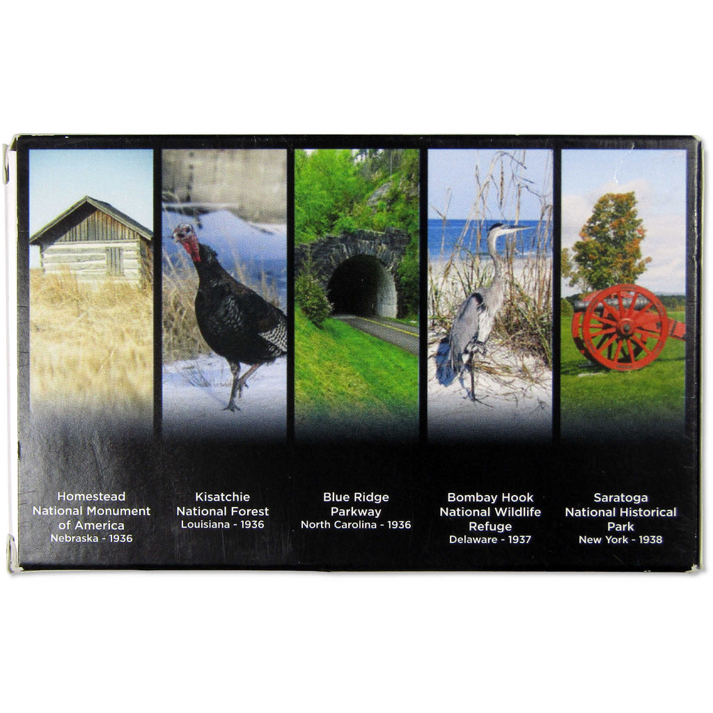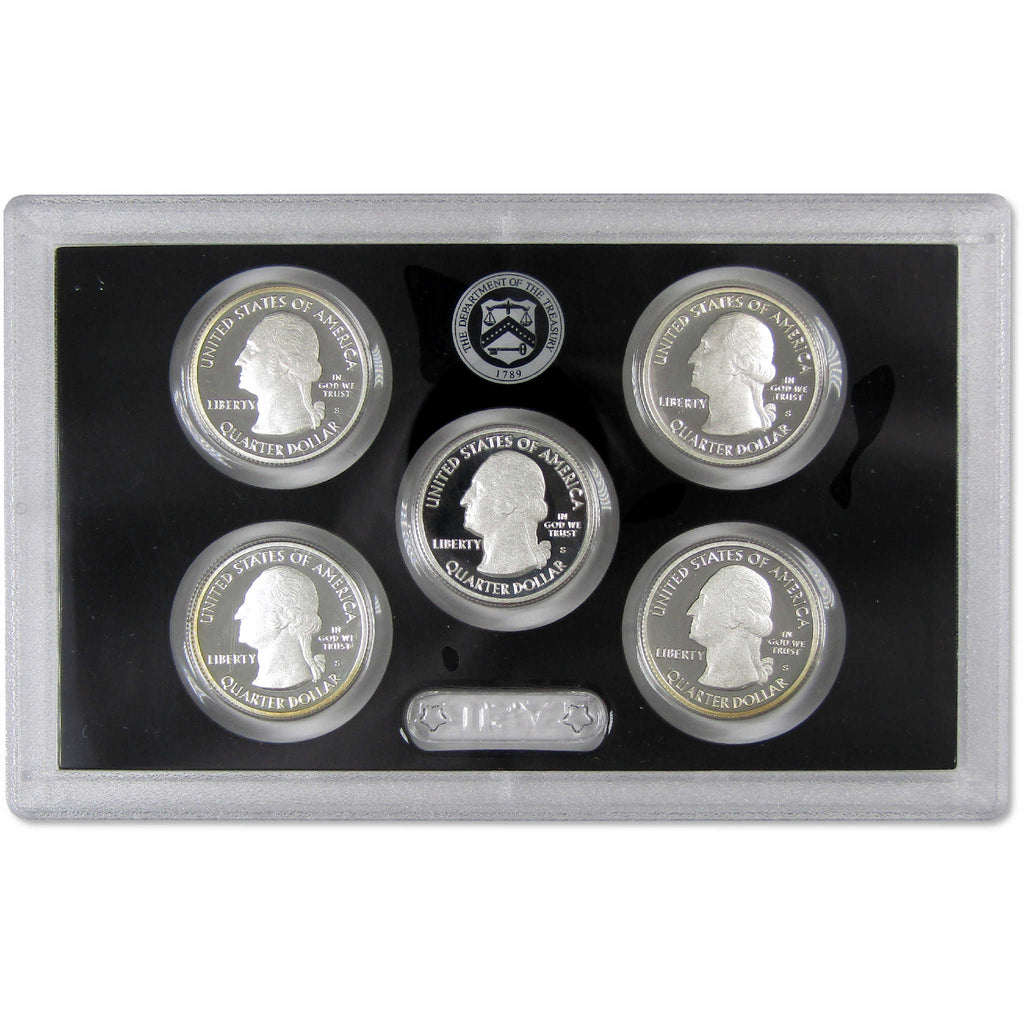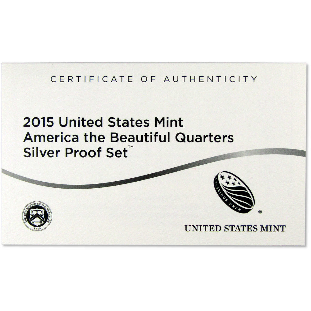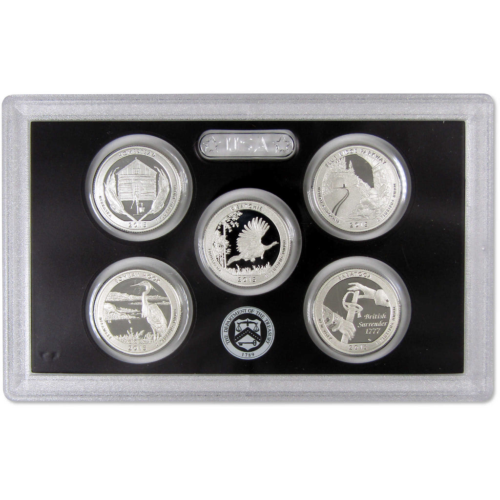 This official 2015 U.S. Mint 5 coin America the Beautiful Quarter Silver Proof Set contains all five National Park quarter issues, featuring designs honoring Homestead National Monument of America in Nebraska, Kisatchie National Forest in Louisiana, Blue Ridge Parkway in North Carolina, Bombay Hook National Wildlife Refuge in Delaware, and Saratoga National Historical Park in New York. All coins bear the San Francisco "S" mint mark, and feature extra sharp images and mirror-like surfaces. Each coin contains 90% silver. Comes with the original U.S. Mint packaging, including a certificate of authenticity.
