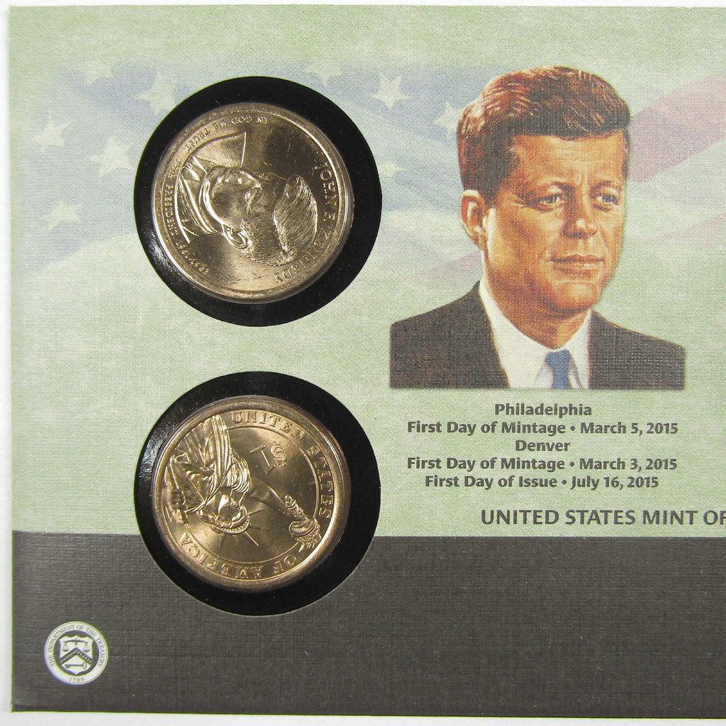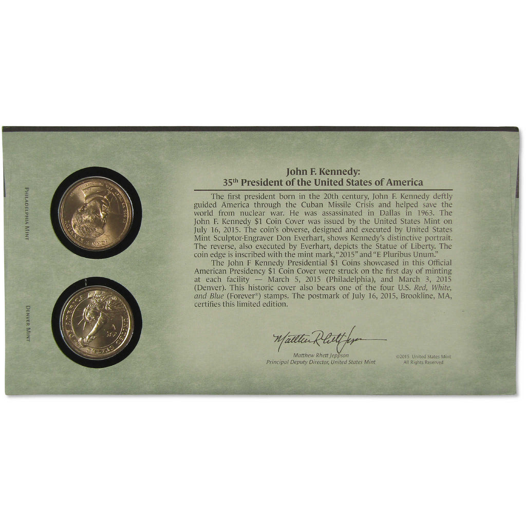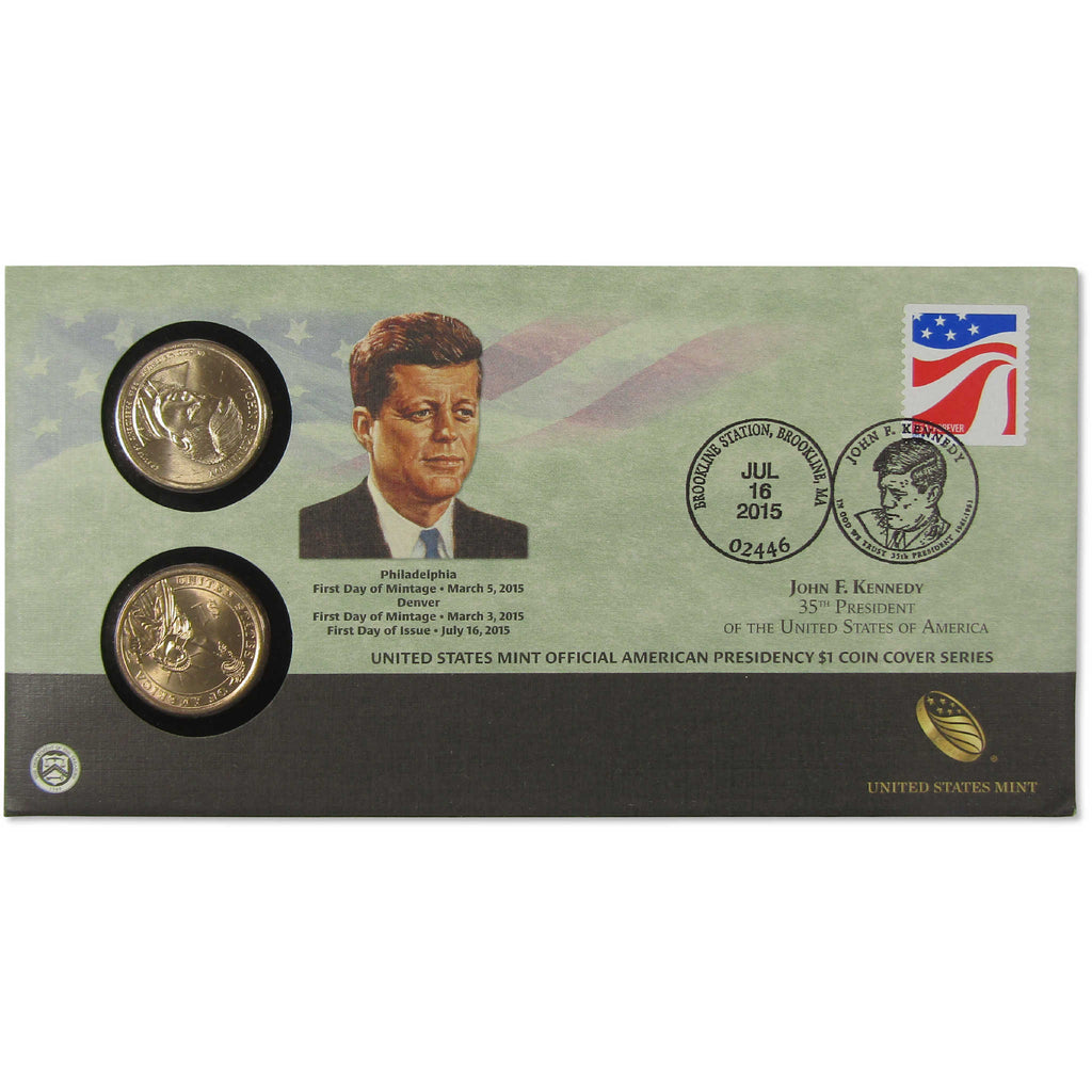 The 2015 John F. Kennedy American Presidency $1 Coin Cover is the 35th issue in the United States Mint American Presidency $1 Coin Cover Series, and includes two circulating finish Kennedy Presidential $1 Coins from the first day of production at the bureau's facilities March 5, 2015 (Philadelphia facility), and March 3, 2015 (Denver facility). The coins are mounted on a display card placed inside an envelope with a Red, White, and Blue (Forever) stamp. The cover also features President Kennedy's portrait and the postmark of July 16, 2015, Brookline, MA, which marks the day the United States Mint issued the coin cover.