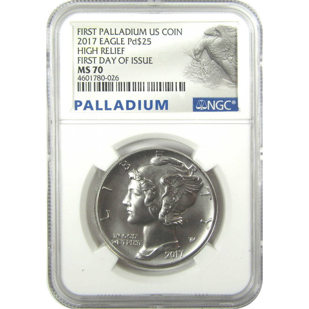 A genuine 2017 High Relief $25 American Eagle Palladium Bullion Coin, graded and certified MS 70 by NGC. Contains 1 oz 0.9995 Palladium. First Day of Issue