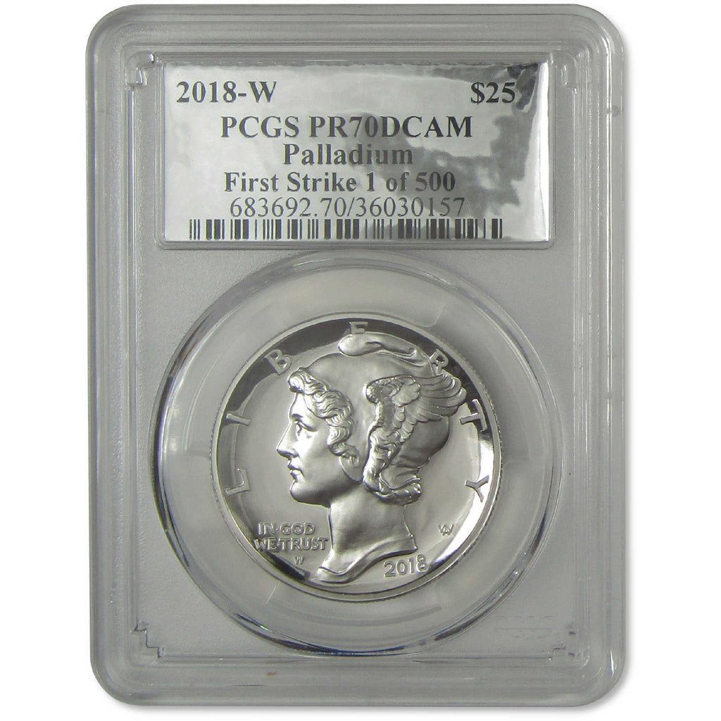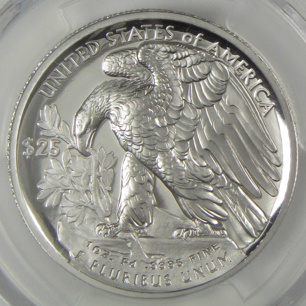 A genuine 2018 W $25 American Eagle Palladium Proof Bullion Coin, graded and certified PR 70 DCAM by PCGS. Contains 1 oz 0.9995 Palladium. First Strike