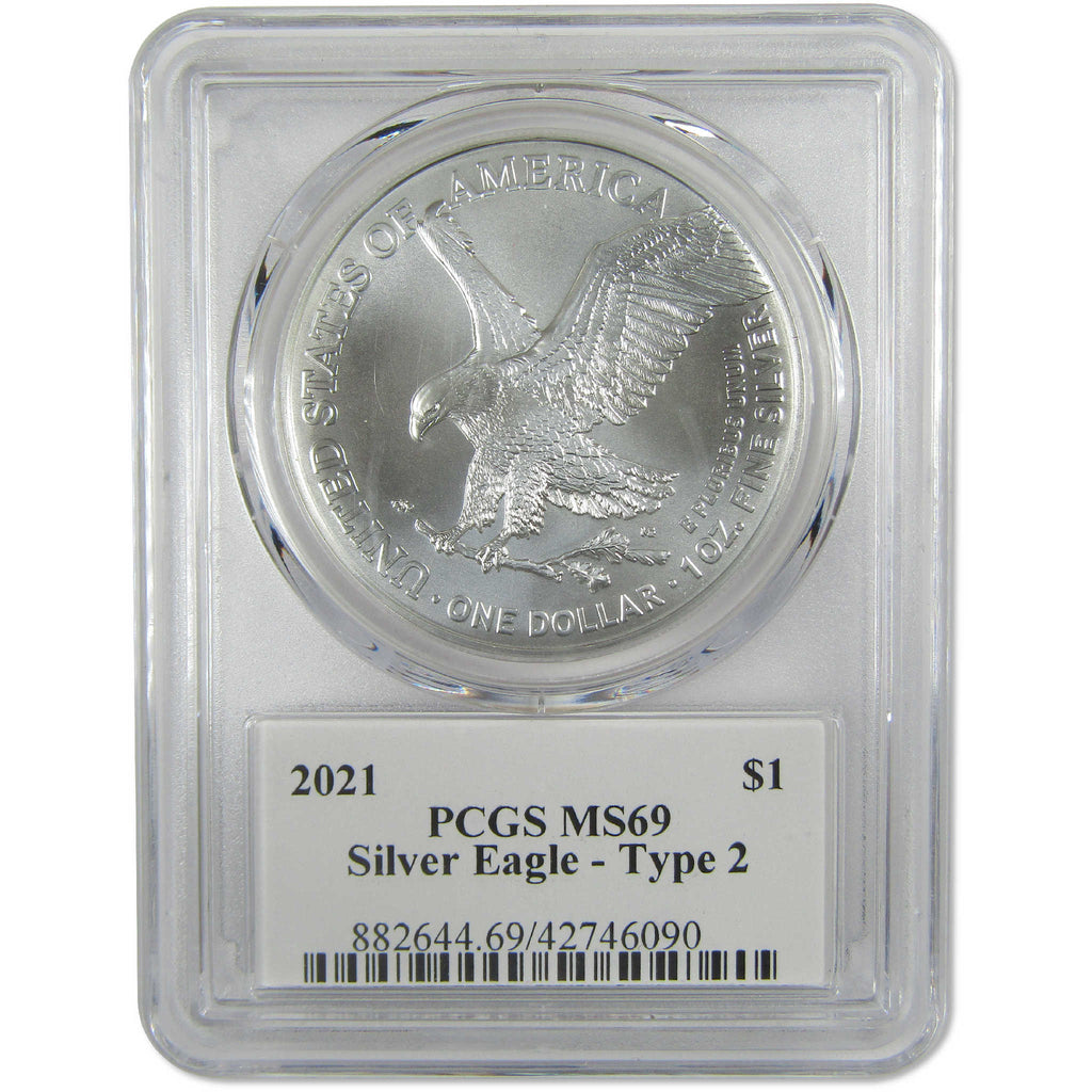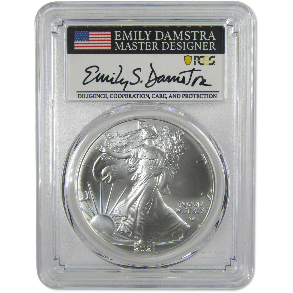 A genuine 2021 Type 2 American Eagle Silver Dollar Bullion Coin, graded and certified MS 69 by PCGS. Contains 1 oz 0.999 Silver. Signed by Master Designer Emily Damstra