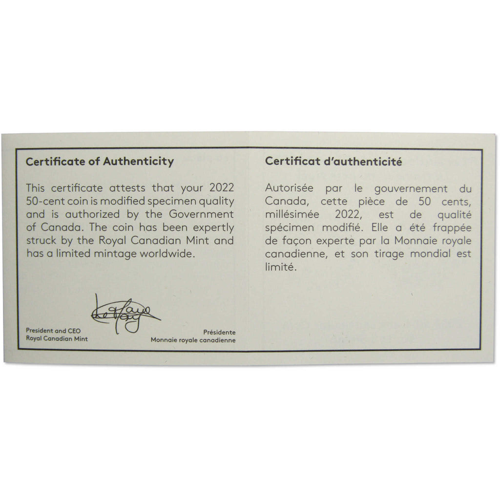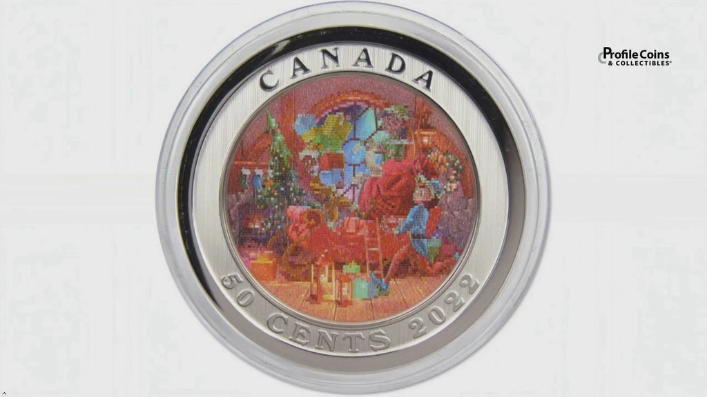A genuine 2022 Santa's Sleigh 50 Cent Colorized Proof Lenticular Coin from the Royal Candian Mint. Comes with the original mint packaging, including a certificate of authenticity