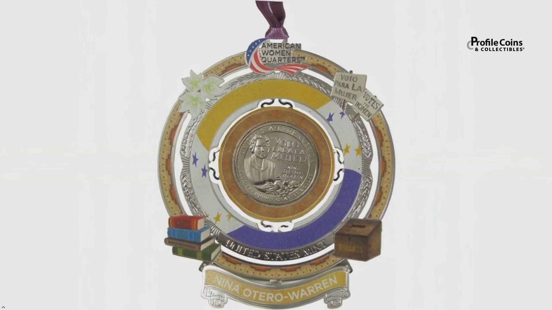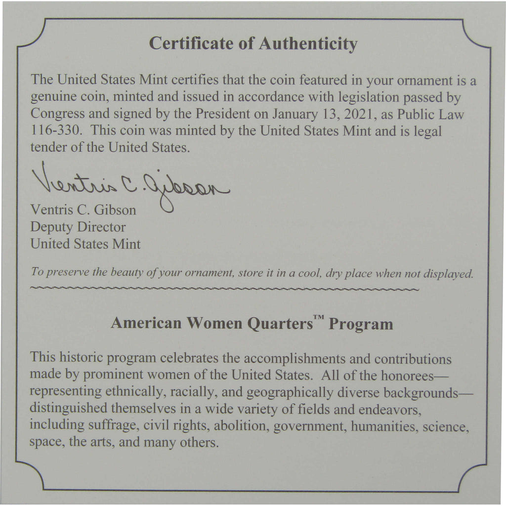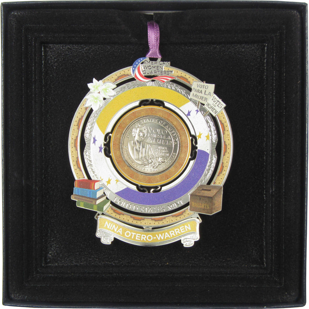 This collectible keepsake ornament from the U.S. Mint's American Women Quarters Program honors Nina Otero-Warren, suffragist, educator, politician and advocate for women, children and Hispanic and Native American communities. As the first woman superintendent of Santa Fe public schools, she strove to improve education for all New Mexicans. Exquisitely designed and hand-crafted in solid brass with a rhodium finish, the ornament frames an uncirculated Nina Otero-Warren quarter from the Philadelphia Mint.