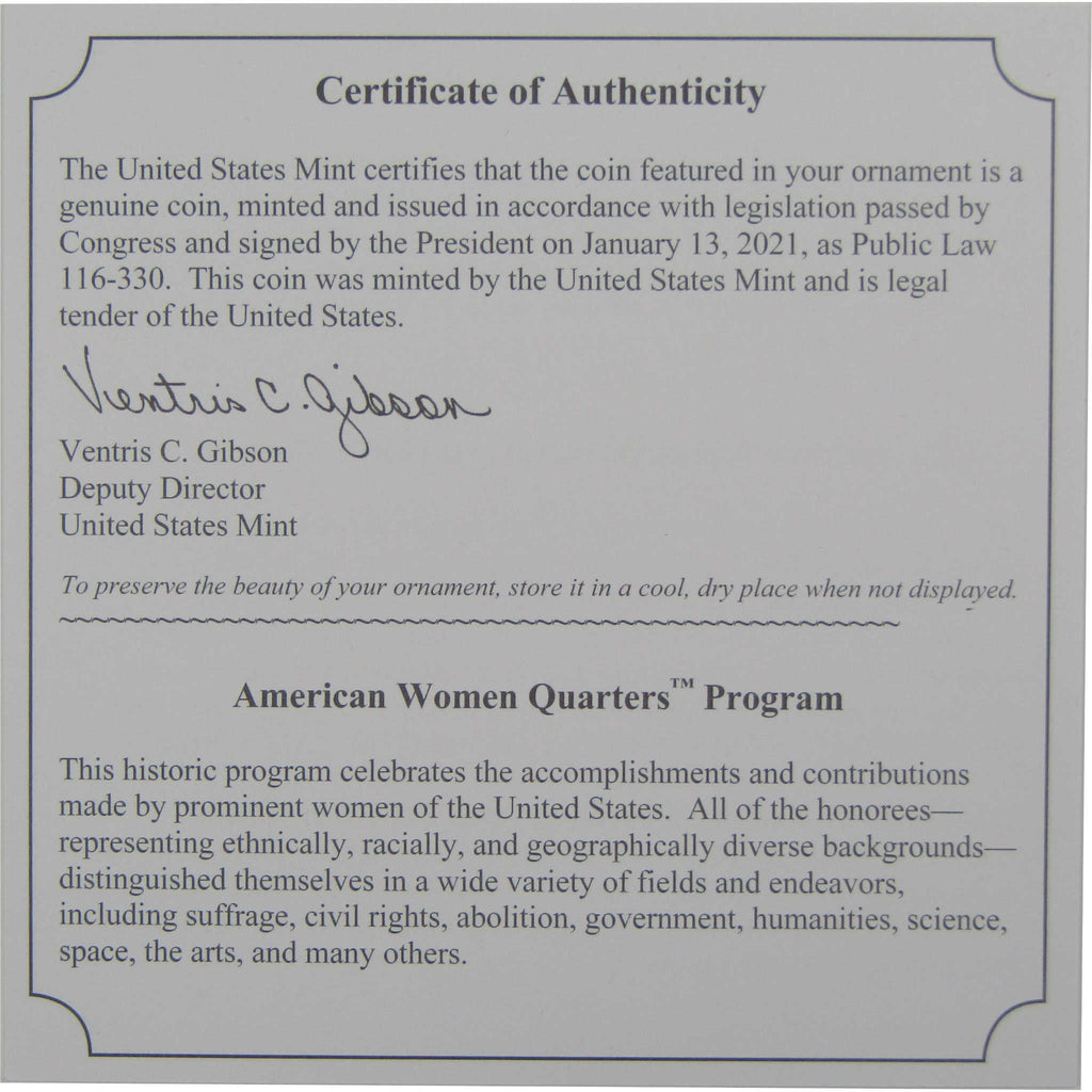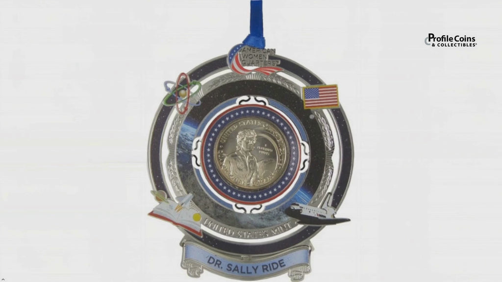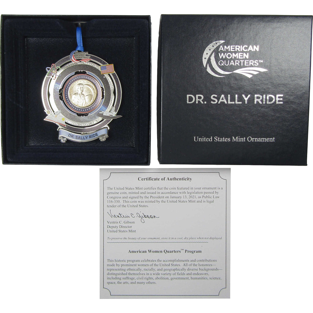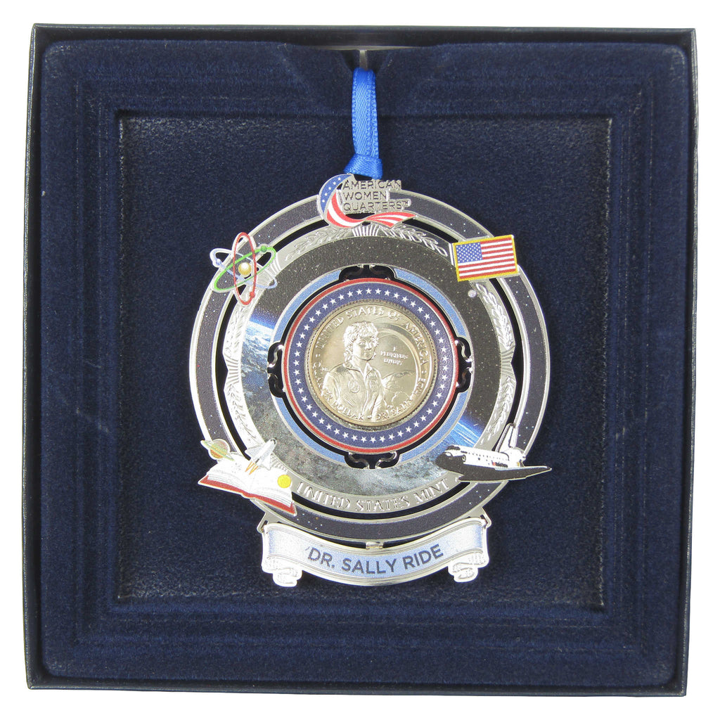 This collectible keepsake ornament from the U.S. Mint's American Women Quarters Program honors Dr. Sally Ride, astronaut, physicist, athlete, and science writer, who on June 18, 1983 became the first American woman to soar into space, capturing the Nation's imagination as a symbol of the ability of women to shatter barriers. Exquisitely designed and hand-crafted in solid brass with a rhodium finish, the ornament frames an uncirculated Dr. Sally Ride quarter from the Philadelphia Mint. Comes with the original government packaging, including a certificate of authenticity.