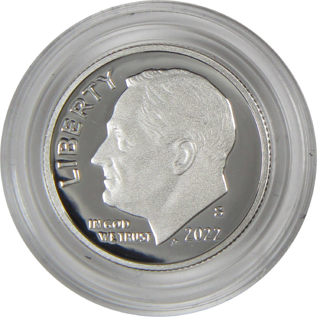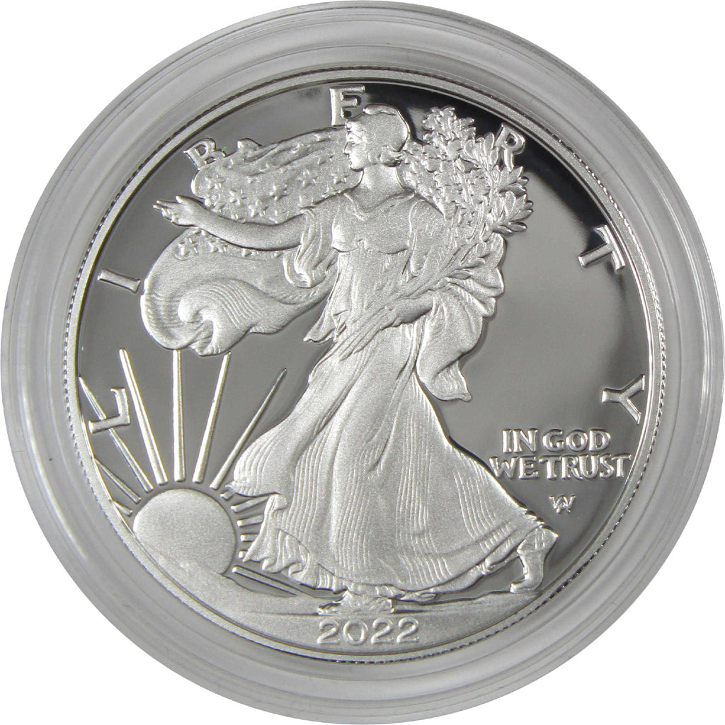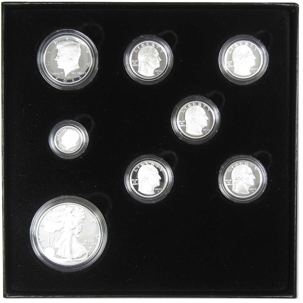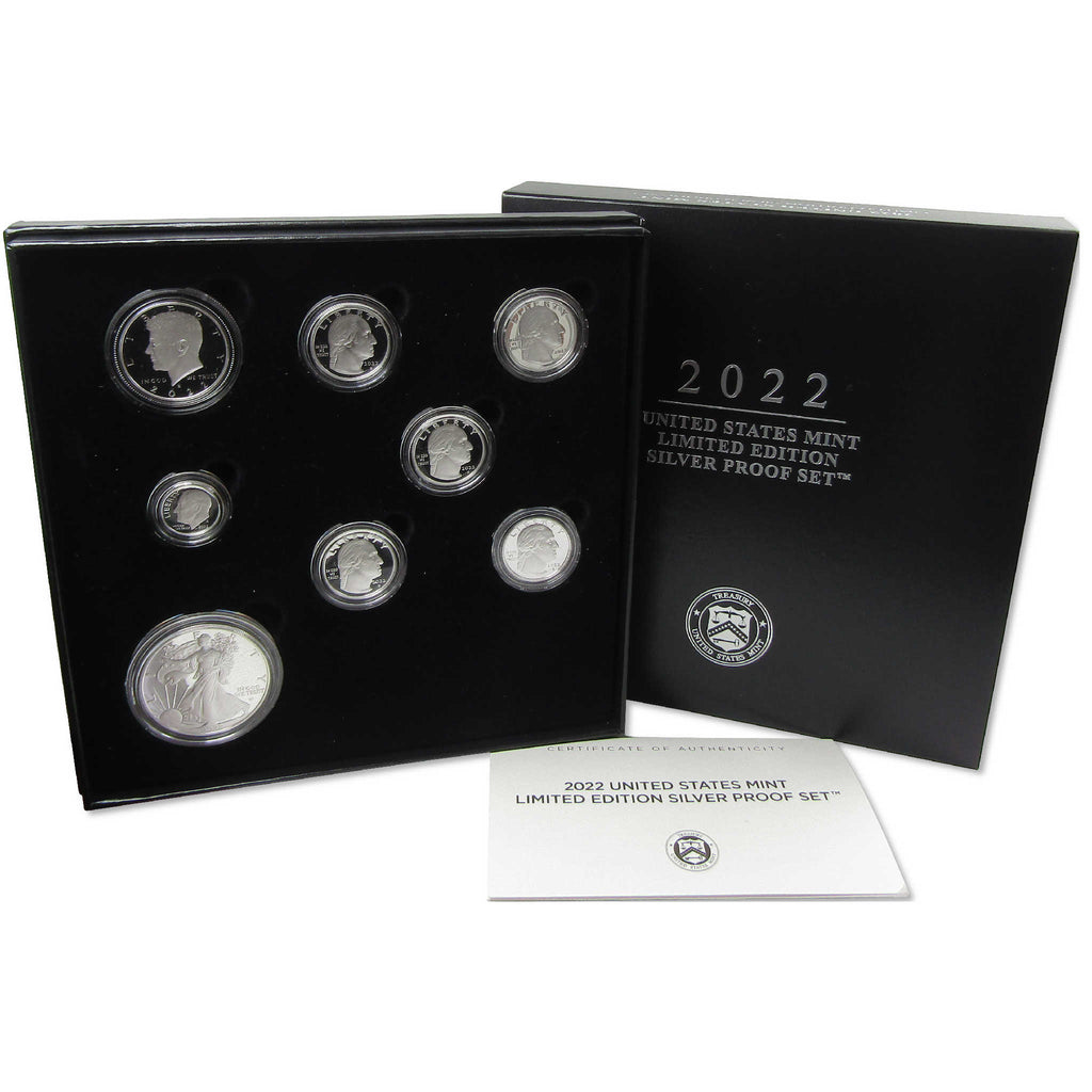 The 2022 Limited Edition Silver Proof Set from the U.S. Mint features eight proof coins struck in 99.9% fine silver at the San Francisco Mint. The set contains one American Eagle 1 oz Silver Proof Coin, one Kennedy half dollar, one Roosevelt dime, and all five American Women Quarters, with reverse designs honoring Maya Angelou, Dr. Sally Ride, Wilma Mankiller, Nina Otero-Warren, Anna May Wong. Each coin is encapsulated and placed in a beautifully designed package. A certificate of authenticity accompanies each set.