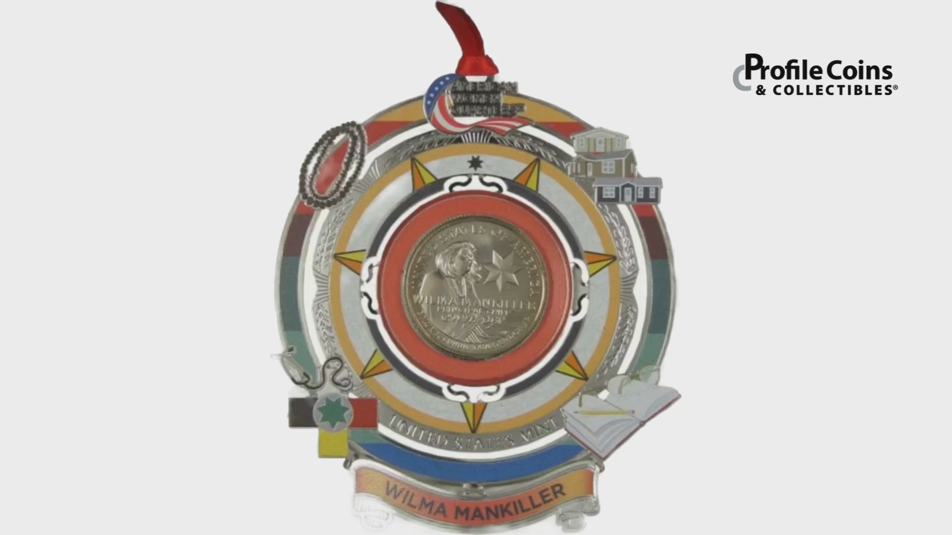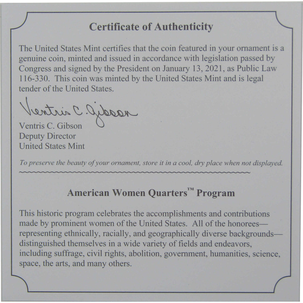 This collectible keepsake ornament from the U.S. Mint's American Women Quarters Program honors Wilma Mankiller, the first woman elected chief of the Cherokee Nation. Her administration revitalized the Cherokee Nation through extensive community development, including improvements to health care and education. Exquisitely designed and hand-crafted in solid brass with a rhodium finish, the ornament frames an uncirculated Wilma Mankiller quarter from the Philadelphia Mint. Comes with the original government packaging, including a certificate of authenticity.