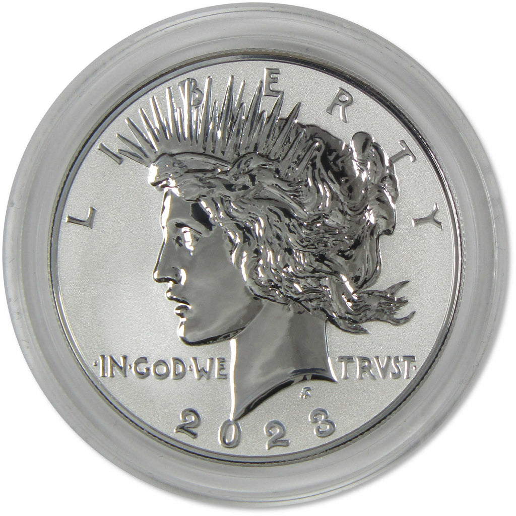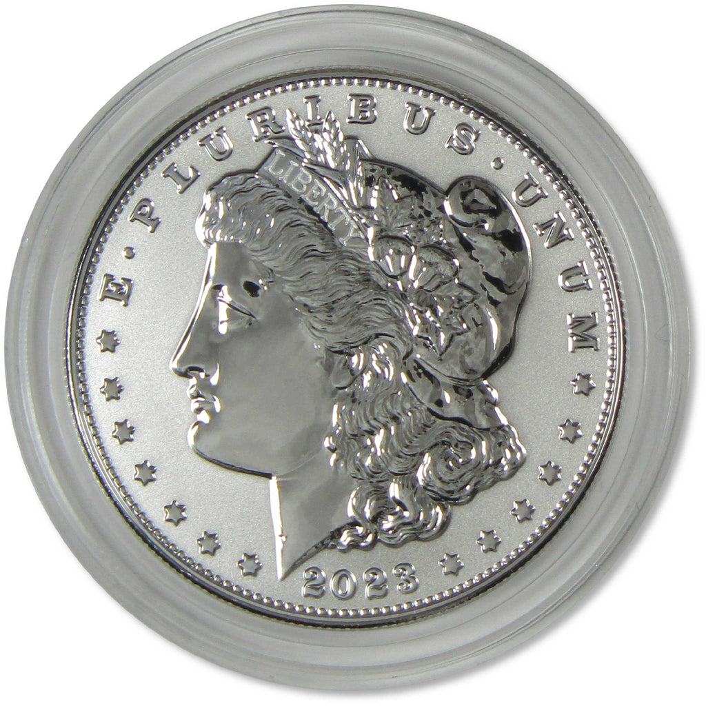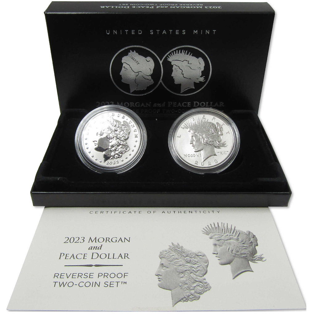 The 2023 Morgan and Peace Dollar Reverse Proof Two-Coin Set from the U.S. Mint contains one Morgan Dollar Coin and one Peace Dollar Coin, minted at the San Francisco Mint in 99.9% silver, with reverse proof finishes. Each set is encapsulated and packaged in a single, elegant black box with sleeve, and accompanied by a Certificate of Authenticity. These modern renditions of the Morgan and Peace Silver Dollars feature two of the most revered designs of Liberty in U.S. coinage history. The Morgan Dollar, designed by George T. Morgan, features an obverse profile of Lady Liberty, and the reverse features a heraldic eagle. The Peace Dollar, designed by Anthony de Francisci, features the Goddess of Liberty on the obverse and a bald eagle clutching an olive branch on the reverse.