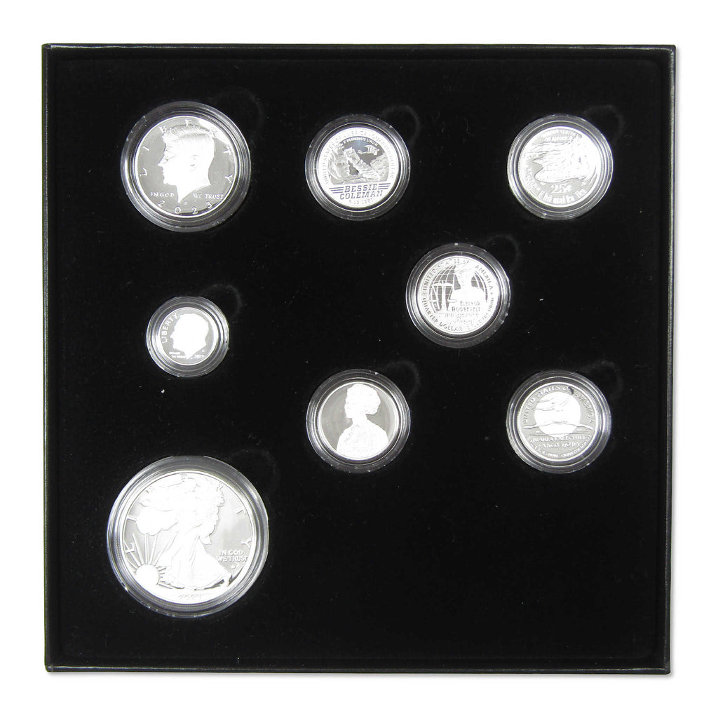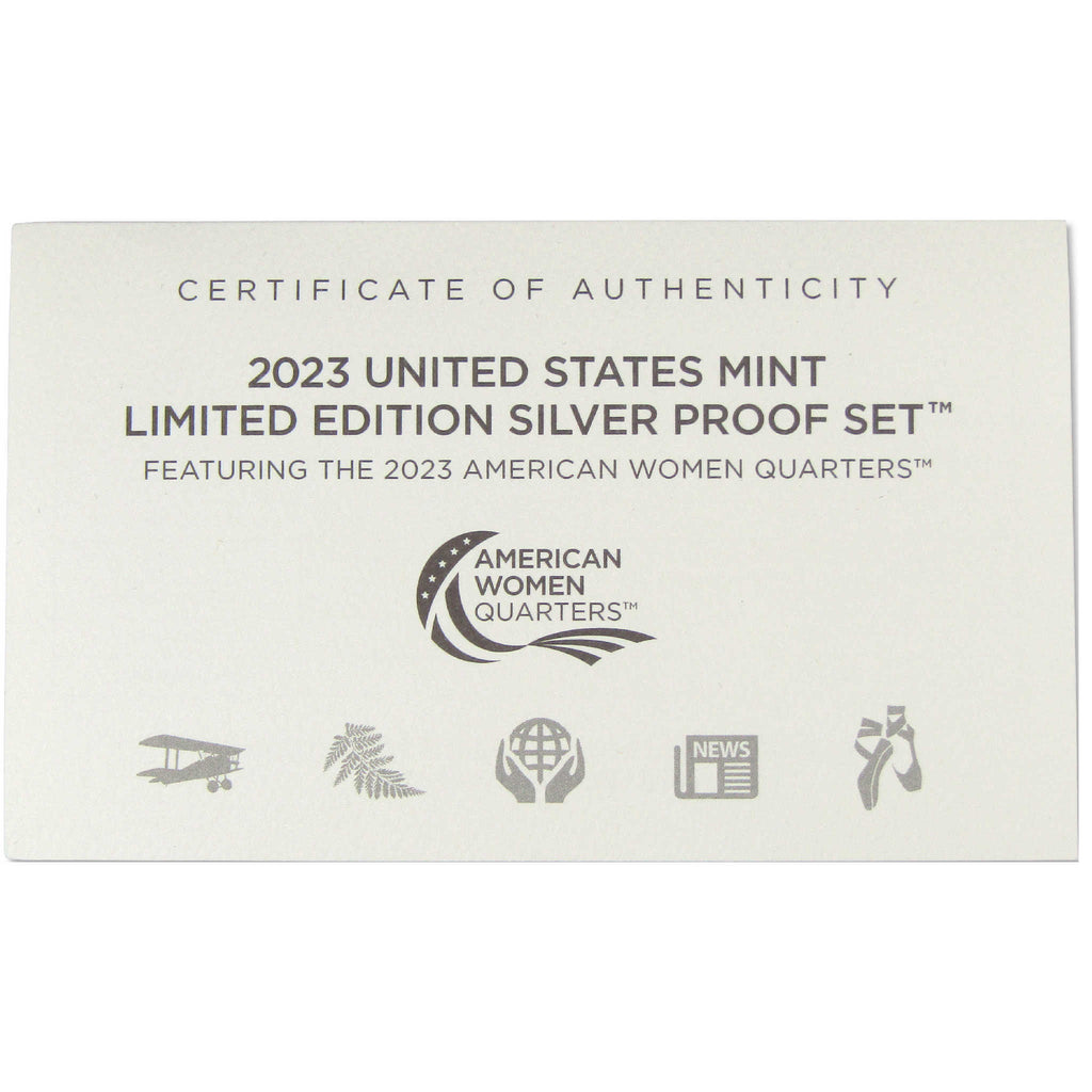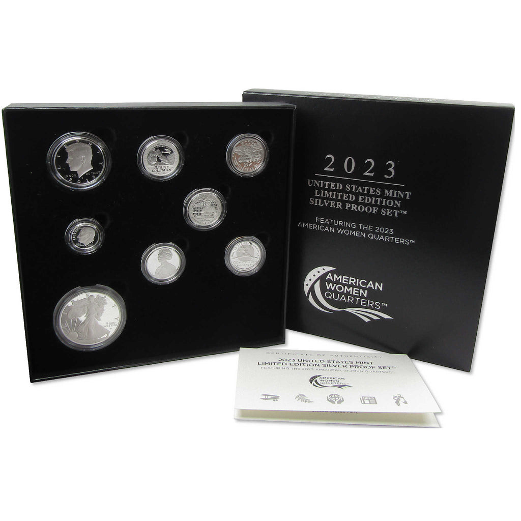 The 2023 Limited Edition Silver Proof Set from the U.S. Mint features eight proof coins struck in 99.9% fine silver at the San Francisco Mint. The set contains one American Eagle 1 oz Silver Proof Coin, one Kennedy half dollar, one Roosevelt dime, and all five American Women Quarters, with reverse designs honoring Bessie Coleman, Edith Kanaka'ole, Eleanor Roosevelt, Jovita Idar, and Maria Tallchief. Each coin is encapsulated and placed in a beautifully designed package. A certificate of authenticity accompanies each set.