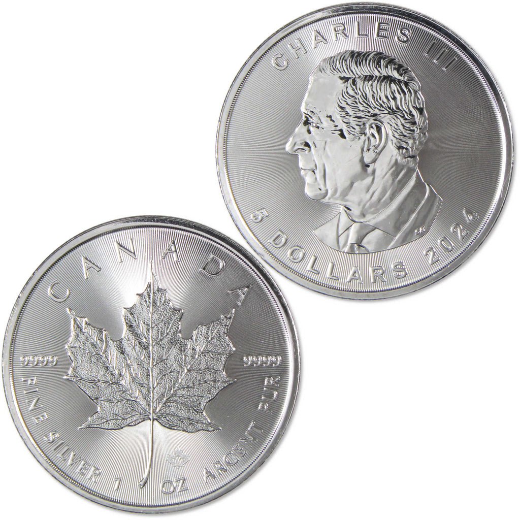 A genuine 2024 $5 Canadian Maple Leaf Silver Bullion Coin, from Royal Canadian Mint, in BU Brilliant Uncirculated Condition. Contains 1 oz 0.9999 Silver