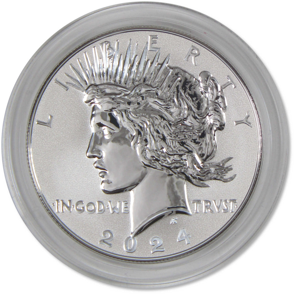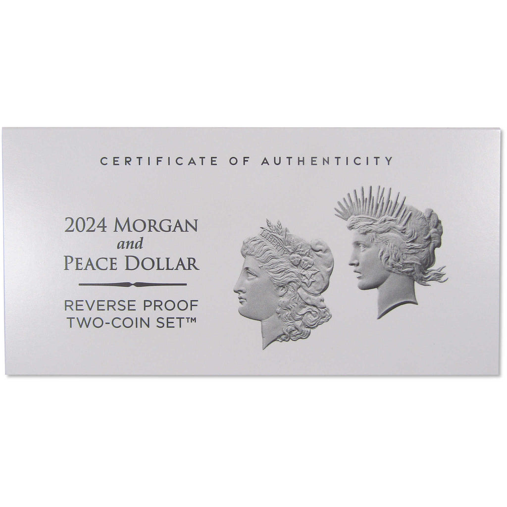 The 2024 Morgan and Peace Dollar Reverse Proof Two-Coin Set from the U.S. Mint contains one Morgan Dollar Coin and one Peace Dollar Coin, minted at the San Francisco Mint in 99.9% silver, with reverse proof finishes. Each set is encapsulated and packaged in a single, elegant blue box with sleeve, and accompanied by a Certificate of Authenticity. These modern renditions of the Morgan and Peace Silver Dollars feature two of the most revered designs of Liberty in U.S. coinage history. The Morgan Dollar, designed by George T. Morgan, features an obverse profile of Lady Liberty, and the reverse features a heraldic eagle. The Peace Dollar, designed by Anthony de Francisci, features the Goddess of Liberty on the obverse and a bald eagle clutching an olive branch on the reverse.