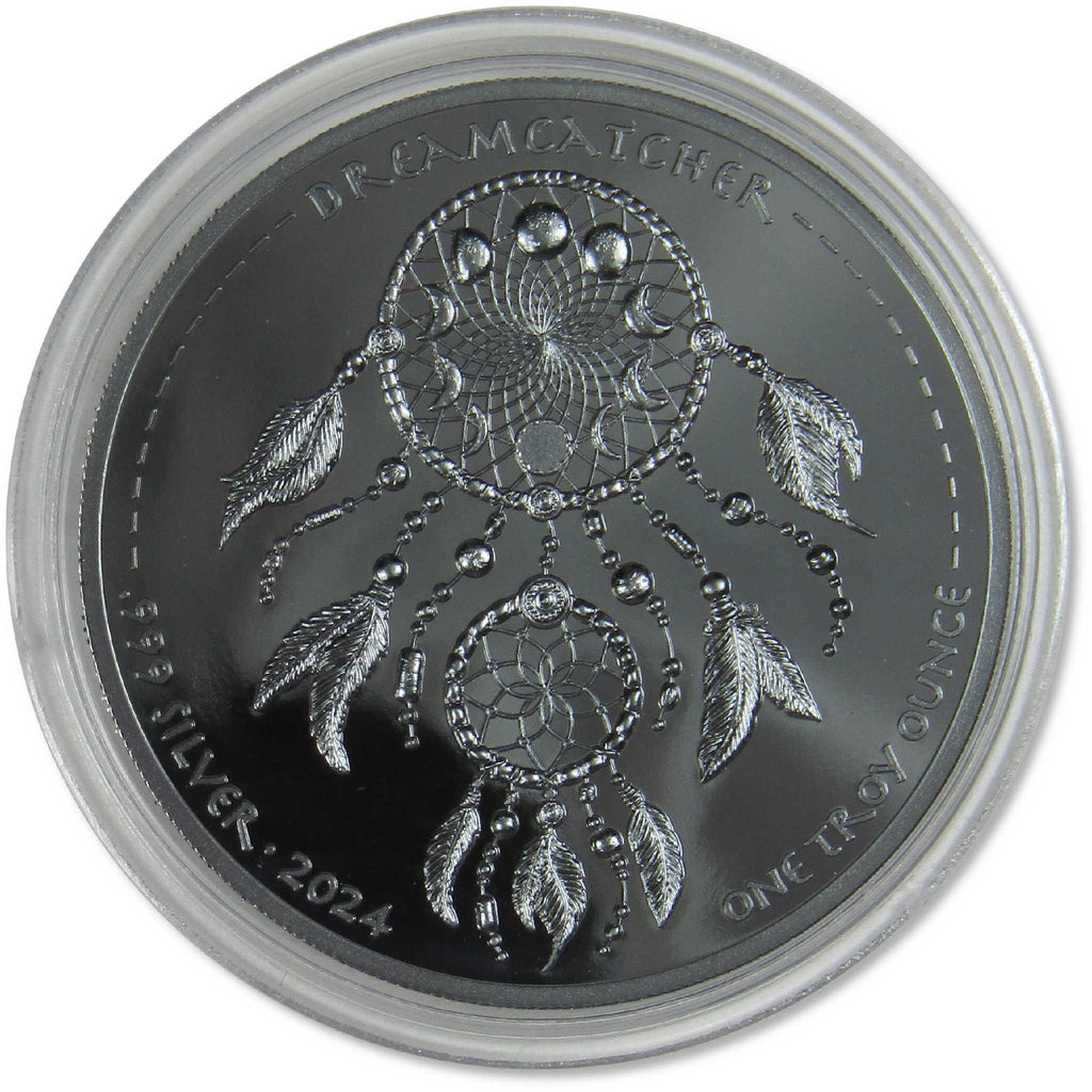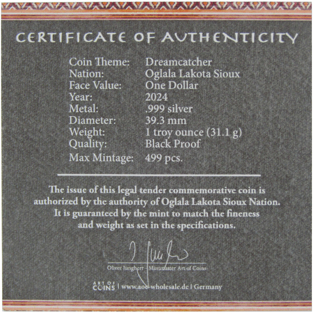 The 2024 Oglala Lakota Sioux: Dreamcatcher Black Proof Silver Dollar, honors the sacred Native American Dreamcatcher, a talisman that was traditionally hung above a bed or cradle to sift through dreams and visions to prevent bad dreams and evil spirits from affecting one's nighttime slumber. Measuring 39.3 mm in diameter, this 1 oz .999 silver coin features a black proof finish. Comes in a protective clear capsule along with a Certificate of Authenticity. Limited mintage of only 499 pieces.