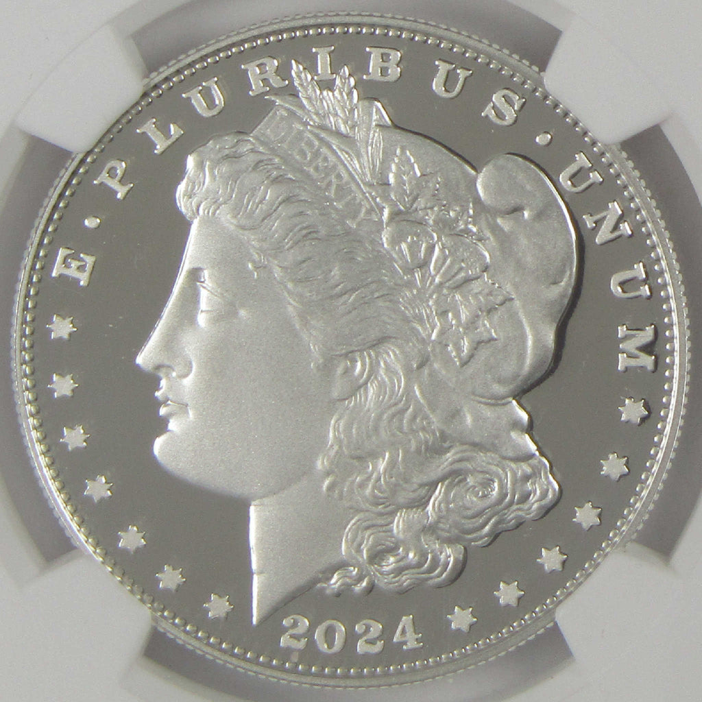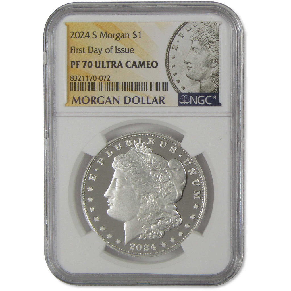 A genuine 2024 S Morgan Silver Dollar Proof Bullion Coin, graded and certified PF 70 UCAM by NGC. Contains 0.859 oz 0.999 Silver. First Day of Issue