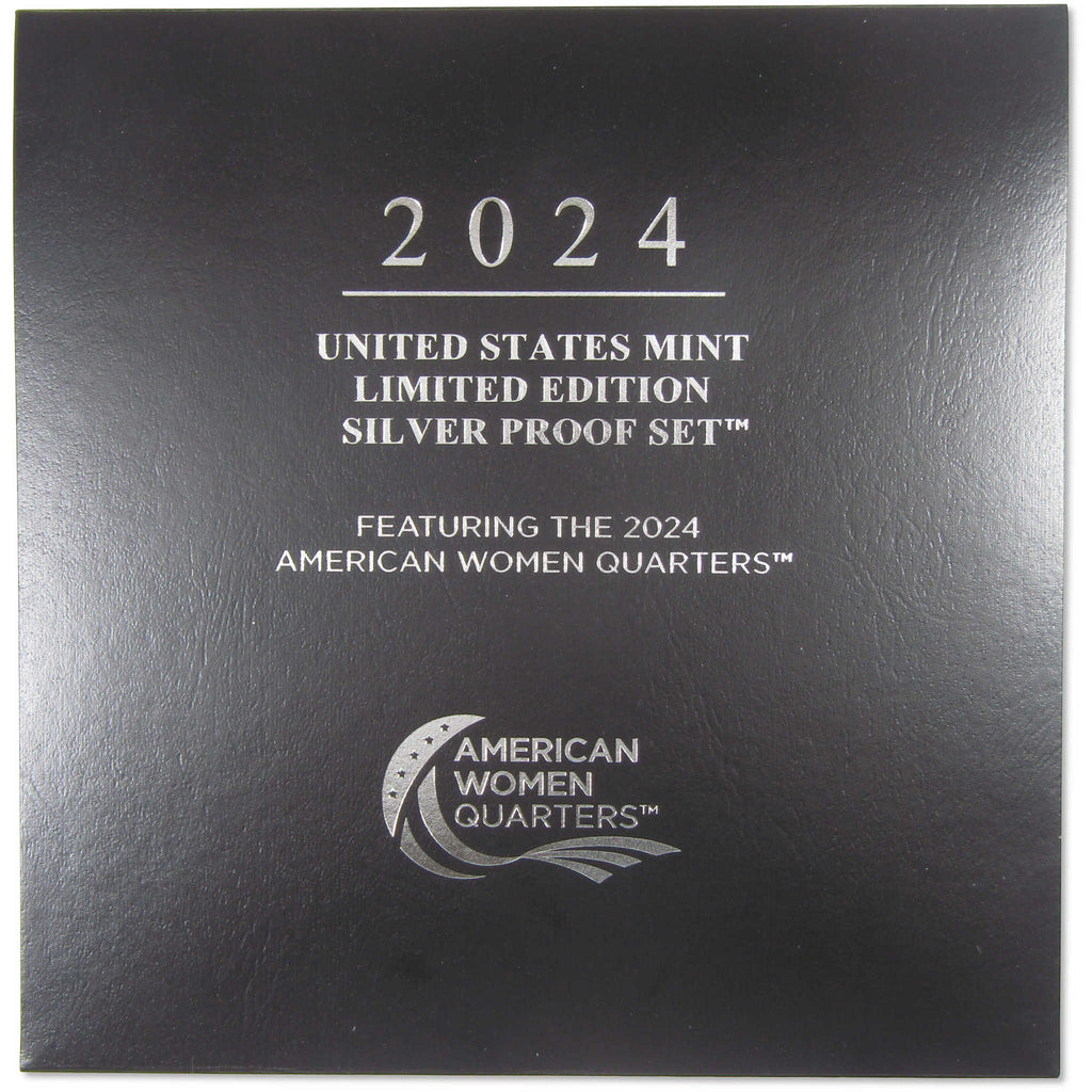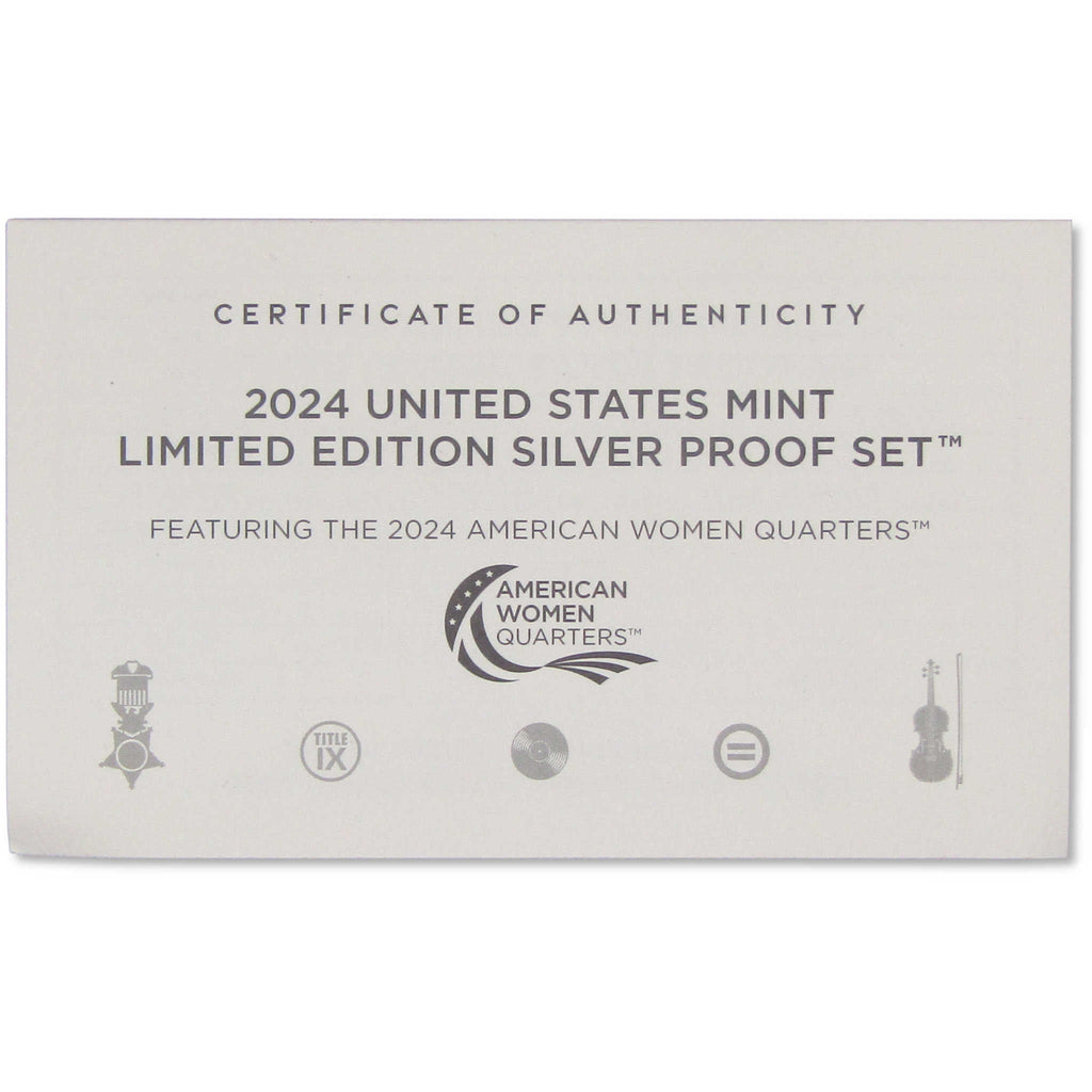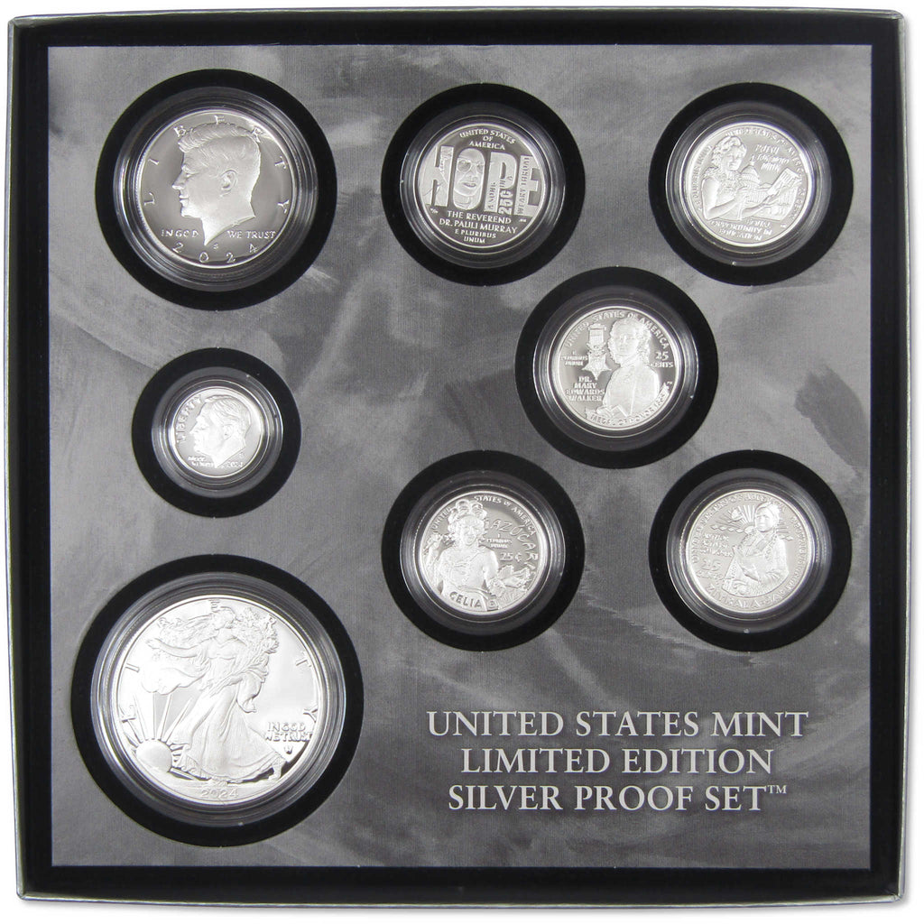 The 2024 Limited Edition Silver Proof Set from the U.S. Mint features eight proof coins struck in 99.9% fine silver at the San Francisco Mint. The set contains one American Eagle 1 oz Silver Proof Coin, one Kennedy half dollar, one Roosevelt dime, and all five American Women Quarters, with reverse designs honoring Rev. Dr. Pauli Murray, the Hon. Patsy Takemoto Mink, Dr. Mary Edwards Walker, Celia Cruz, and Zitkala-Sa. Each coin is encapsulated and placed in a beautifully designed package. A certificate of authenticity accompanies each set.