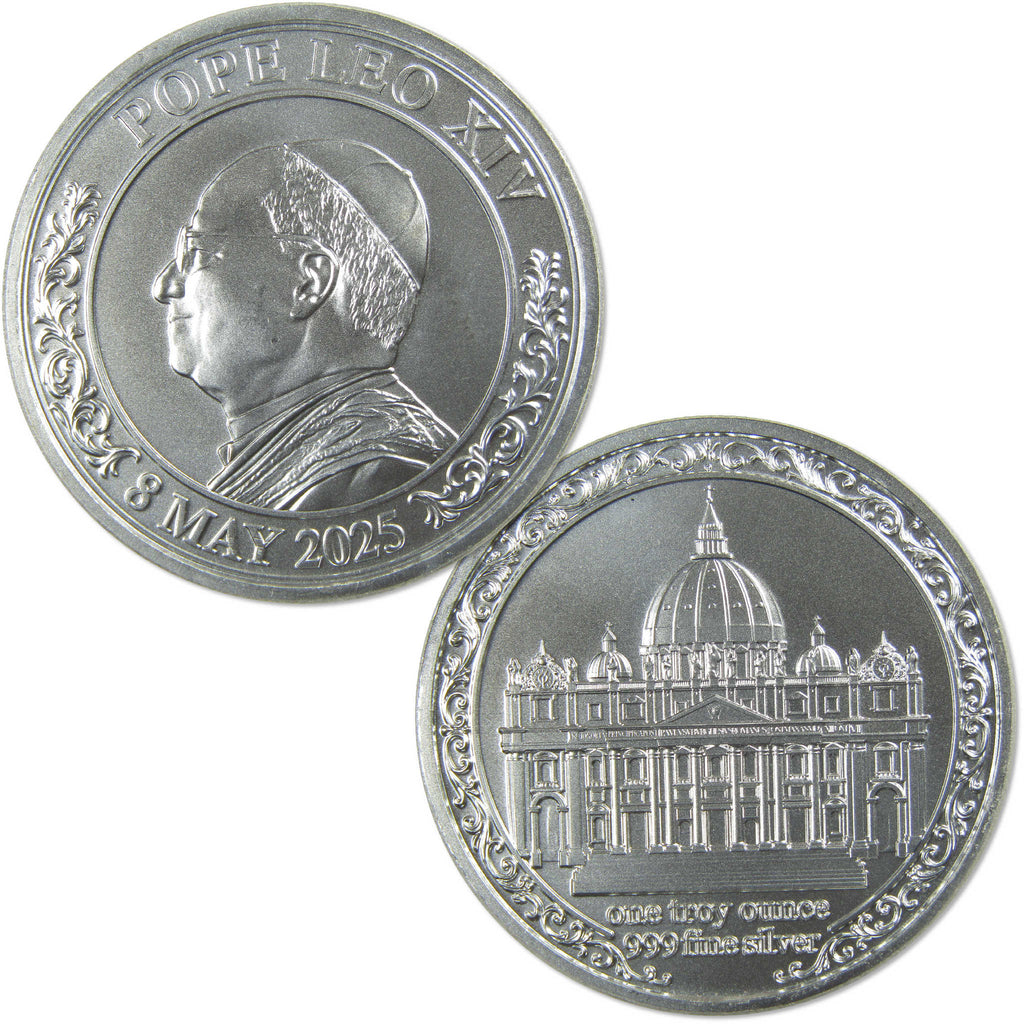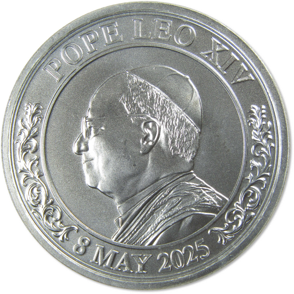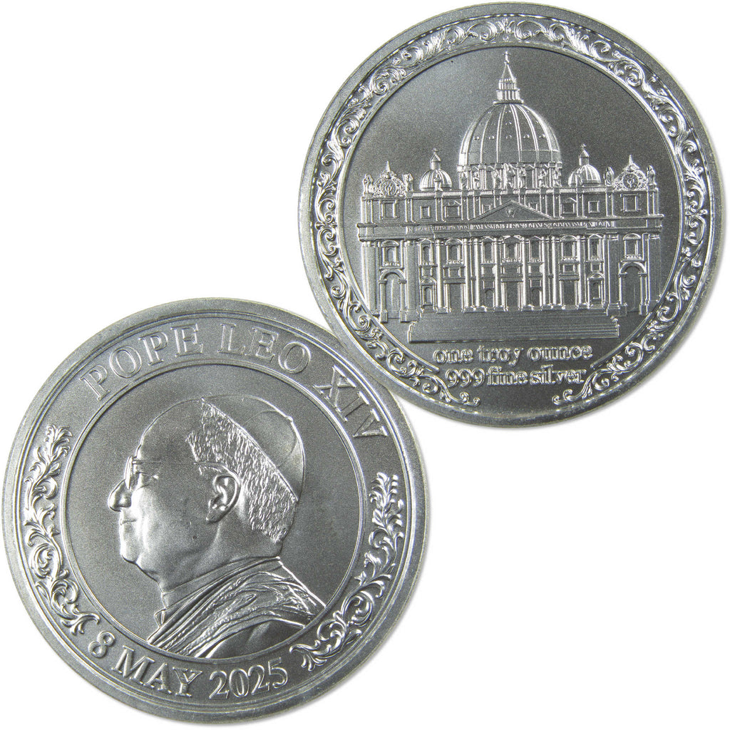 The 2025 1 oz Pope Leo XIV Commemorative Silver Round from the SilverTowne Mint celebrates one of the Catholic Church's most influential figures, the newly elected, first ever American Pope! Measuring 39 mm in diameter, and made from 1 ounce of .999 fine silver, this round combines exceptional detail in design with a historical significant moment in time. The obverse displays an intricate profile image of Pope Leo XIV with the words "POPE LEO XIV" and "8 MAY 2025" (his first day as the bishop of Rome, the Pope) and decorative vines around the rim. The reverse features the outside of the Vatican which serves as the spiritual center of the Roman Catholic Church and the residence of the Pope, housing magnificent structures such as St. Peters Basilica and the Sistine Chapel. The reverse also includes vines around the rim and the weight and purity designation of "one troy ounce 999 fine silver". Ideal for both seasoned collectors and newcomers, this commemorative piece offers beauty and intrinsic value.