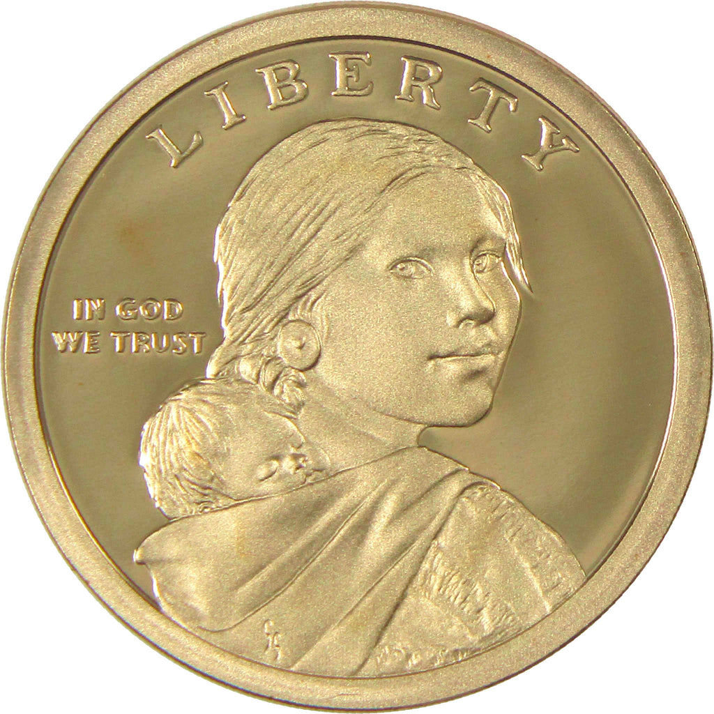 This historic Native American dollar is from America's third "golden dollar" series. Its obverse depicts Lewis & Clark's guide Sacagawea and her infant son, Jean Baptiste. The one-year-only reverse honors Native Americans and their contributions. Inscribed along the edge are the date of issue, mint mark and E PLURIBUS UNUM.