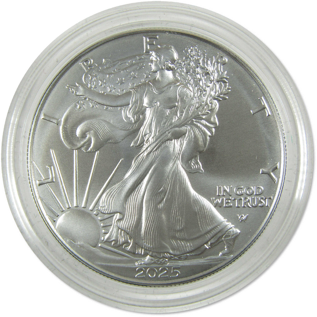 A genuine 2025 W American Eagle Silver Dollar Burnished Bullion Coin, in Uncirculated Mint State Condition. Contains 1 oz 0.999 Silver. Comes with the original government packaging, including a certificate of authenticity