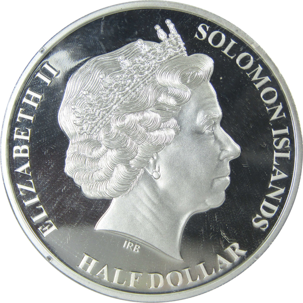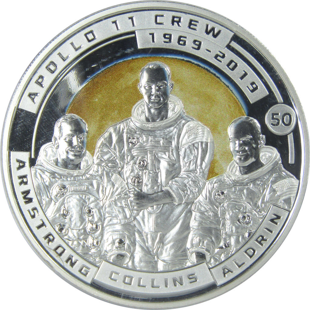 A genuine 2019 Solomon Islands 50th Anniversary of Moon Landing: Apollo 11 Crew Half Dollar Proof Coin. This silver-plated copper coin measures 40 mm in diameter and weighs 28 grams.