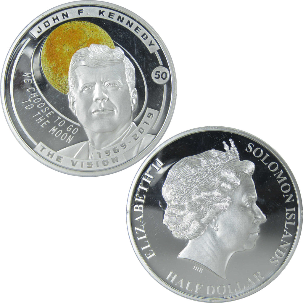 A genuine 2019 Solomon Islands 50th Anniversary of Moon Landing: The Vision Half Dollar Proof Coin. This silver-plated copper coin measures 40 mm in diameter and weighs 28 grams.