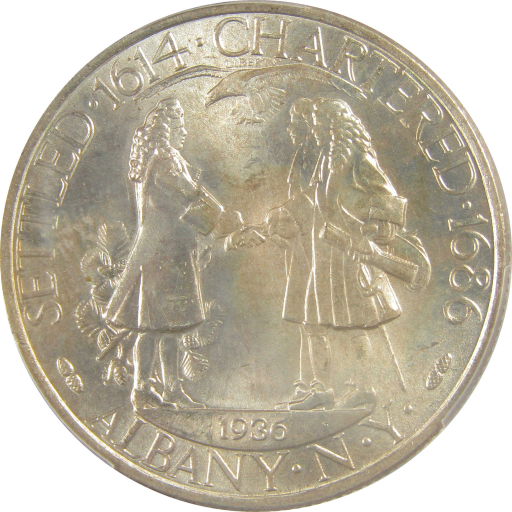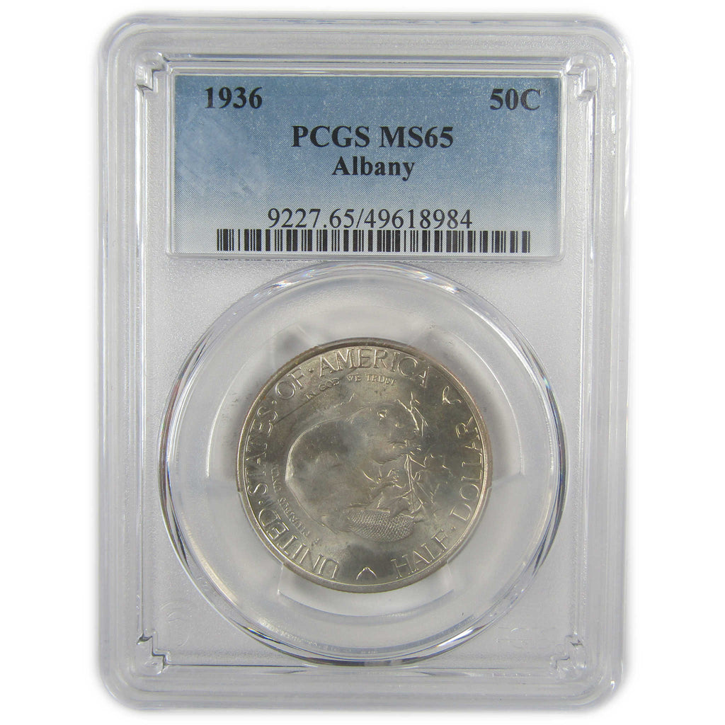 A genuine 1936 Albany New York Charter Commemorative Silver Half Dollar Coin, graded and certified MS 65 by PCGS. Contains 90% Silver
