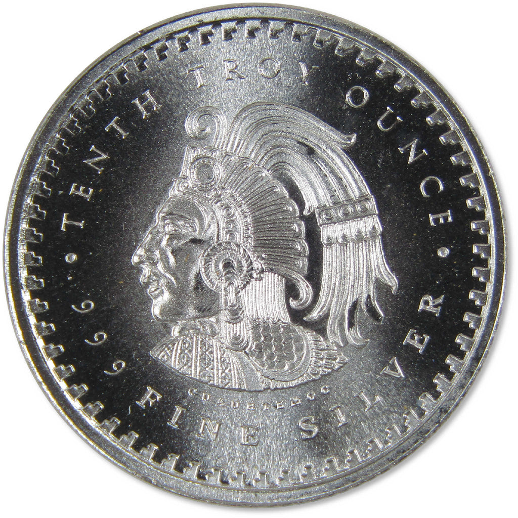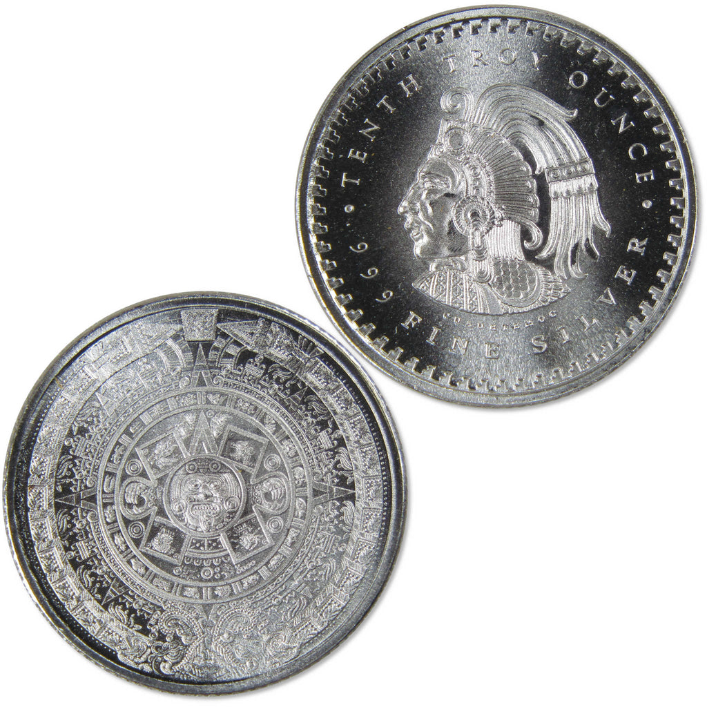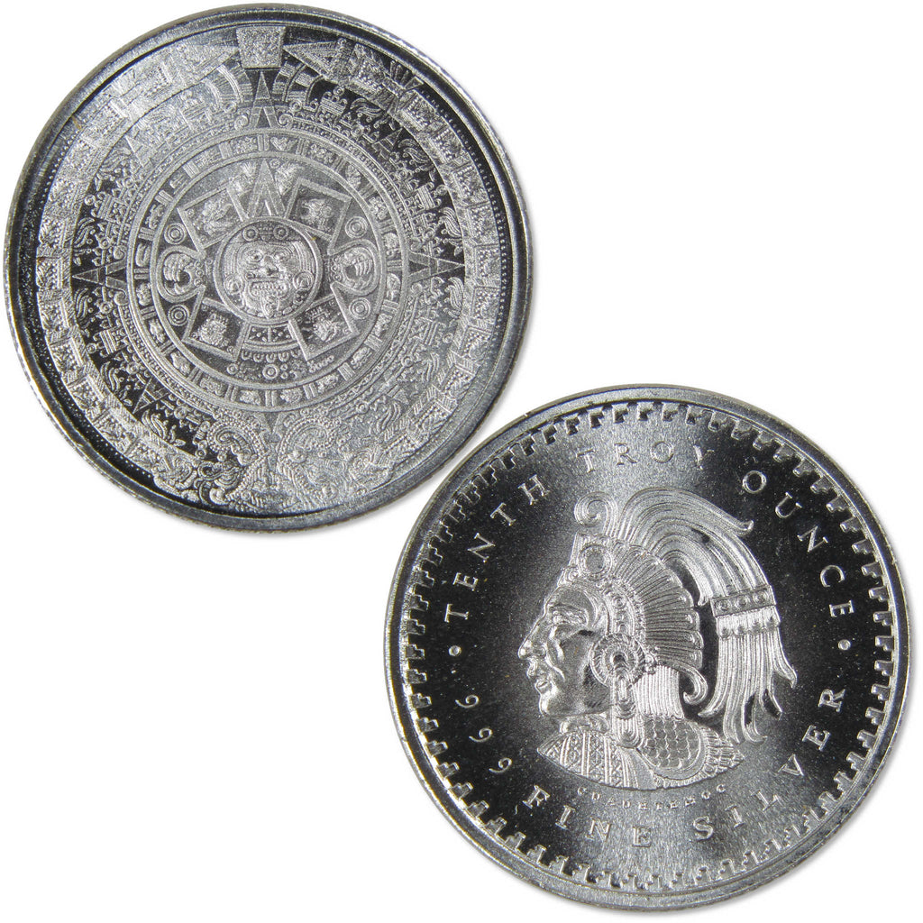 This Aztec Calendar Silver Round, from Golden State Mint, is struck from 1/10 oz of .999 fine silver. The obverse depicts a design modeled after the famed Aztec Calendar stone, originally carved from hardened lava in the late 1400s and dedicated to Tonatiuh, the sun god. Cuauhtmoc, the last Aztec Emperor of Tenochtitlan, is shown on the reverse along with a statement of weight and purity.
