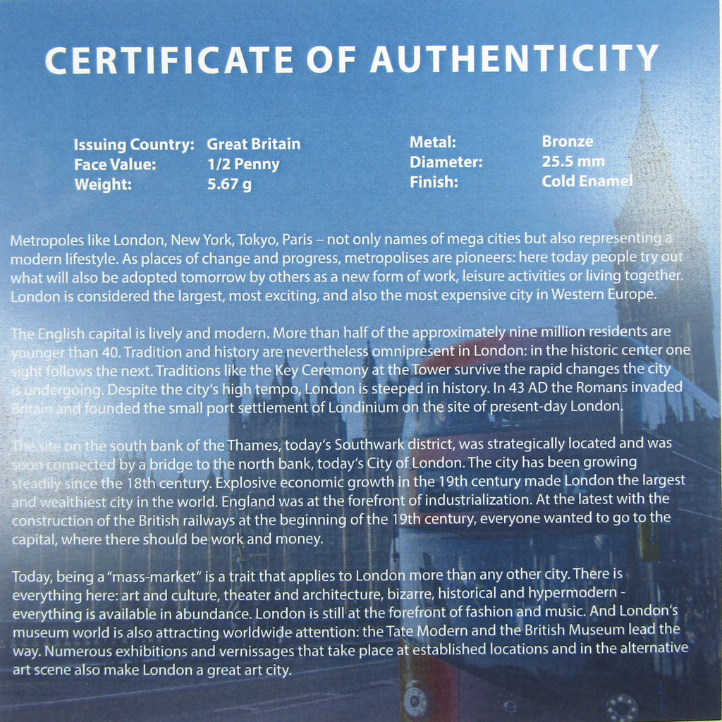 The Cities of the World: London set from The Royal Mint contains seven United Kingdom half pennies, colorized with popular destination in London such as Big Ben, Buckingham Palace, Windsor Castle, Tower of London, Royal Guards, Tower Bridge and an iconic red Telephone Booth. Each coin is encapsulated and comes presented in a handsome display box with a themed certificate of authenticity.