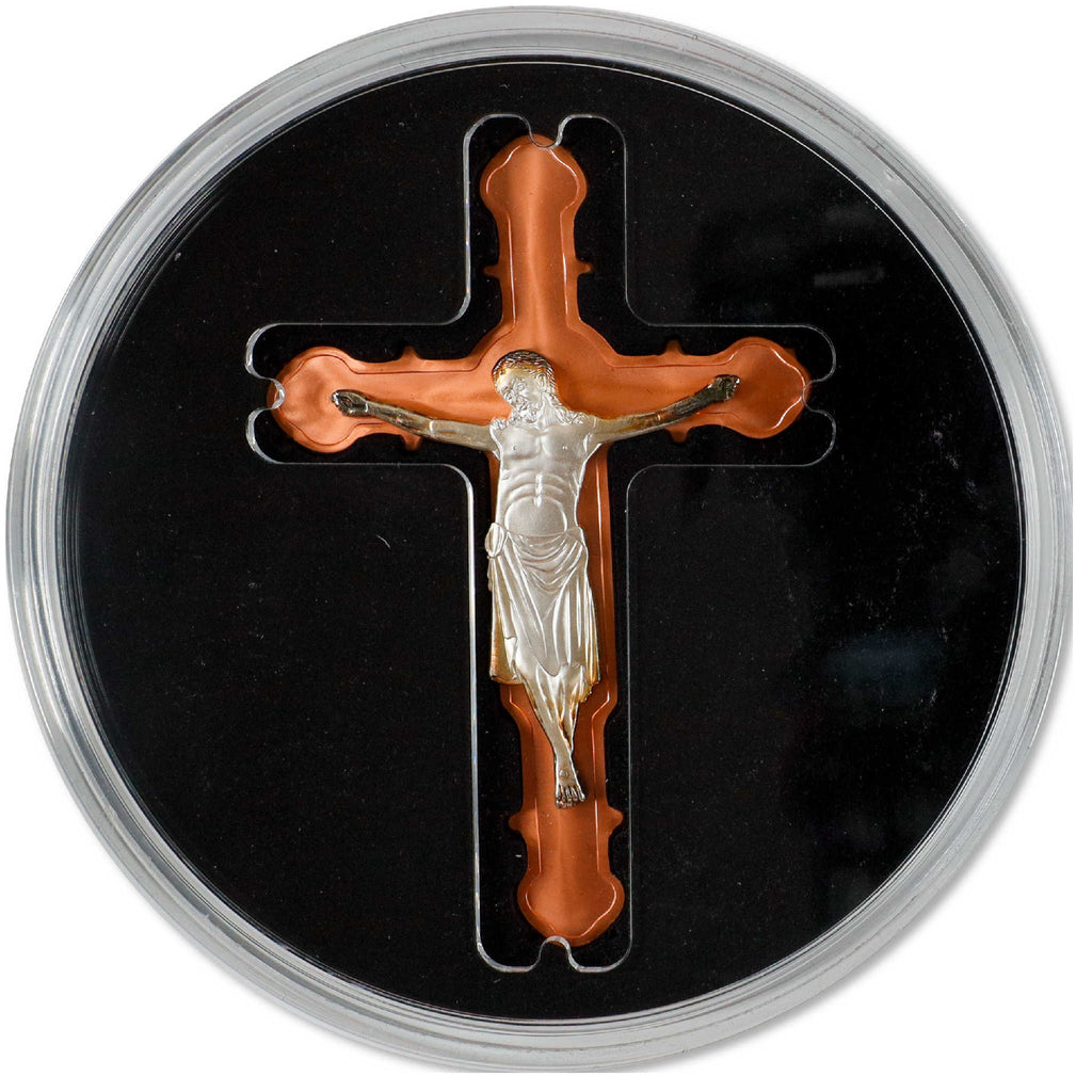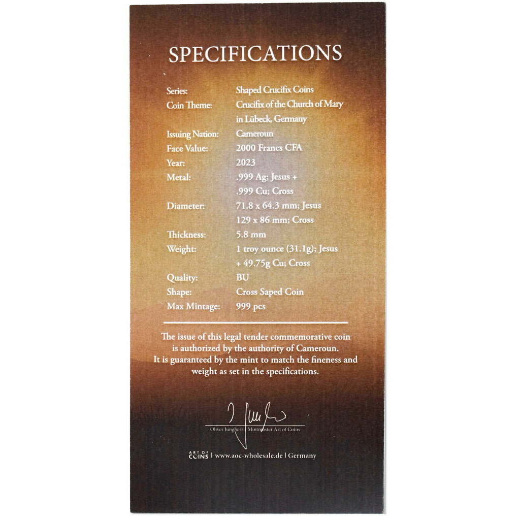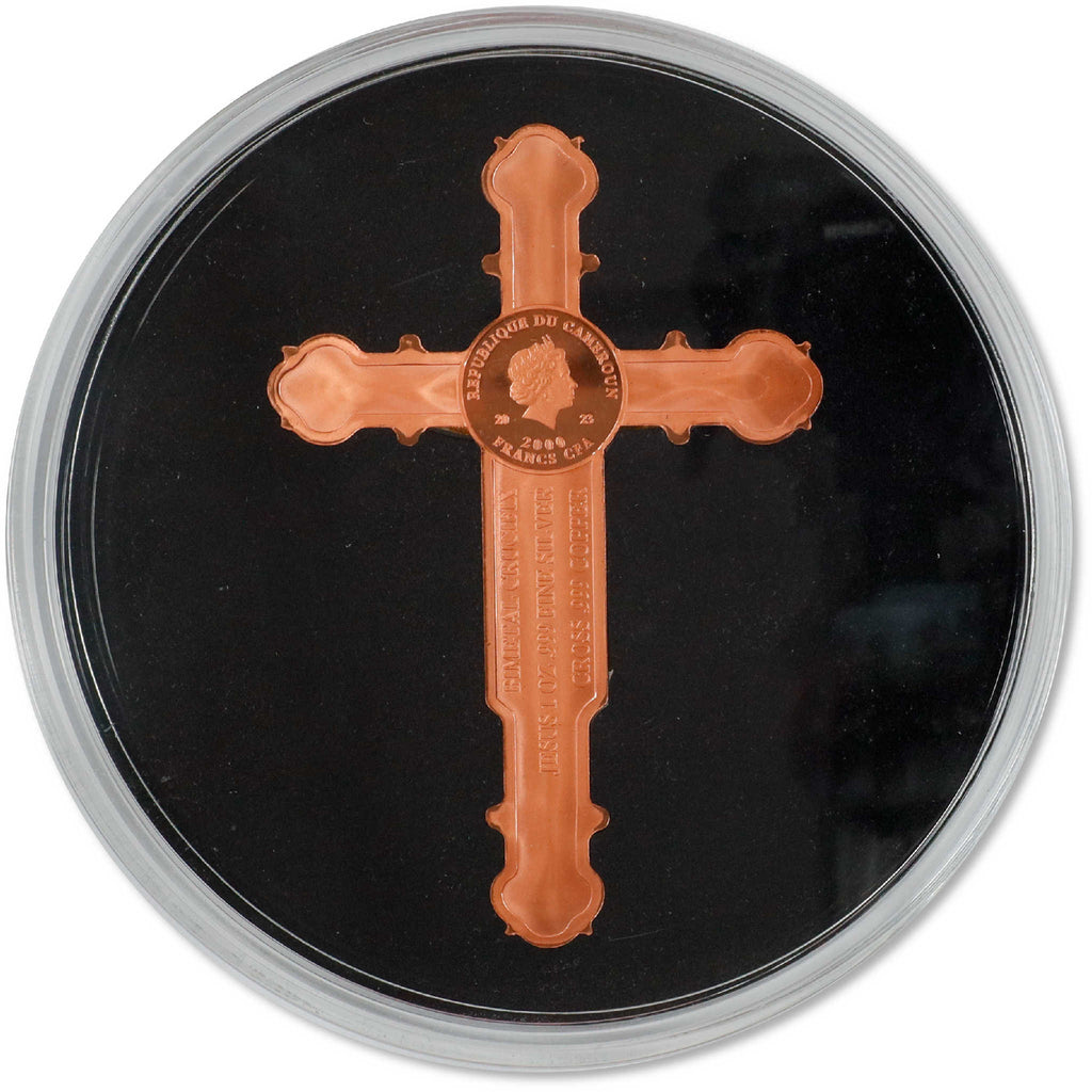 The 2023 Crucifix of the Church of Mary Cross-Shaped Coin, from Art of Coins, depicts the Crucifixion of Christ. This massive bi-metal coin is struck in the shape of the crucifix, and Jesus himself is portrayed on the reverse in 1 oz. of .999 pure silver. The cross is struck in over an ounce of .999 pure copper and measures 129 mm tall by 86 mm wide. This legal tender 2000 Franc CFA commemorative coin is issued by the Republic of Cameroon, and shows a portrait of Queen Elizabeth II on the obverse. Comes encapsulated in a black display box, along with a certificate of authenticity. Extremely limited mintage of just 999 pieces.
