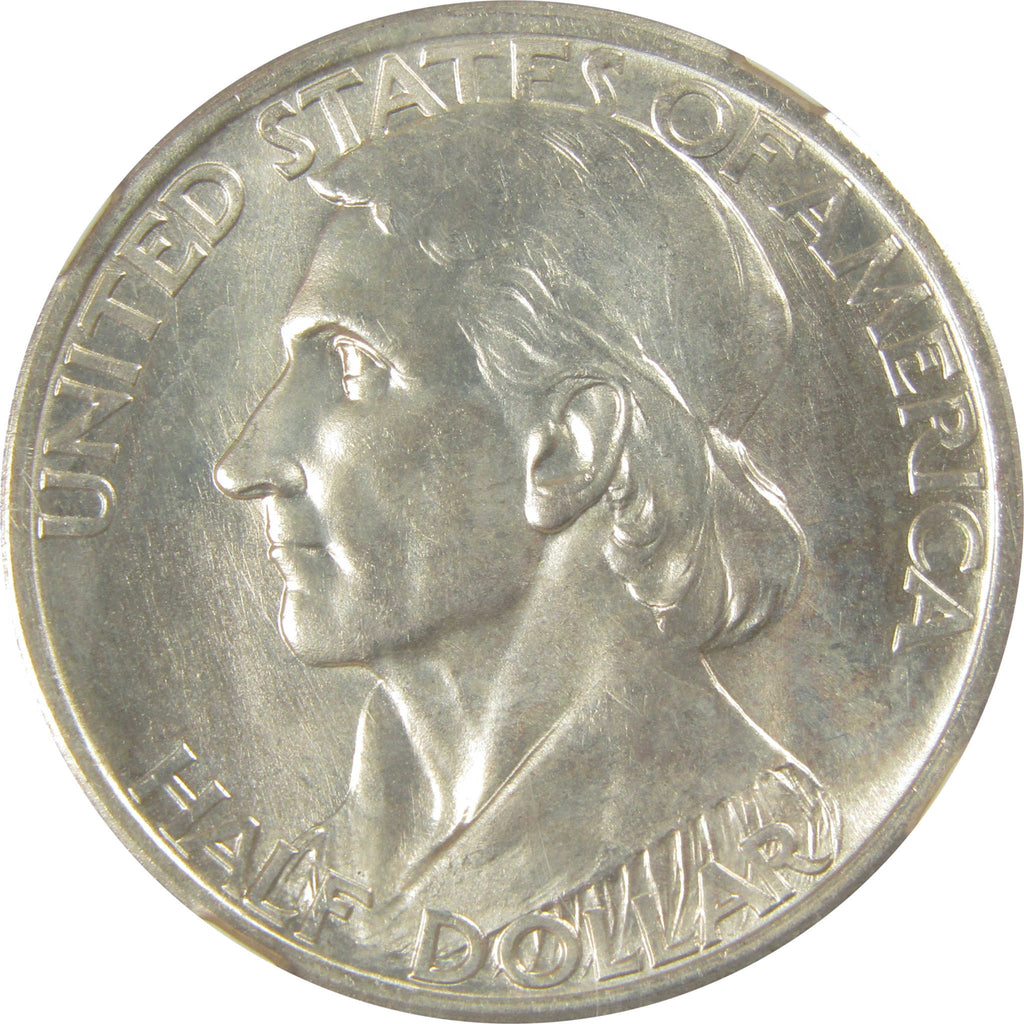 This 90% silver half dollar was struck to commemorate the 200th anniversary of Daniel Boone's birth. The obverse bears a left-facing portrait of the legendary frontiersman. The reverse depicts Boone holding a musket and a map of Kentucky as he meets with Blackfish, a war chief of the Shawnee tribe. The date of issue is below. Coins minted 1935-1938 also bear 1934 pioneer date at the right.