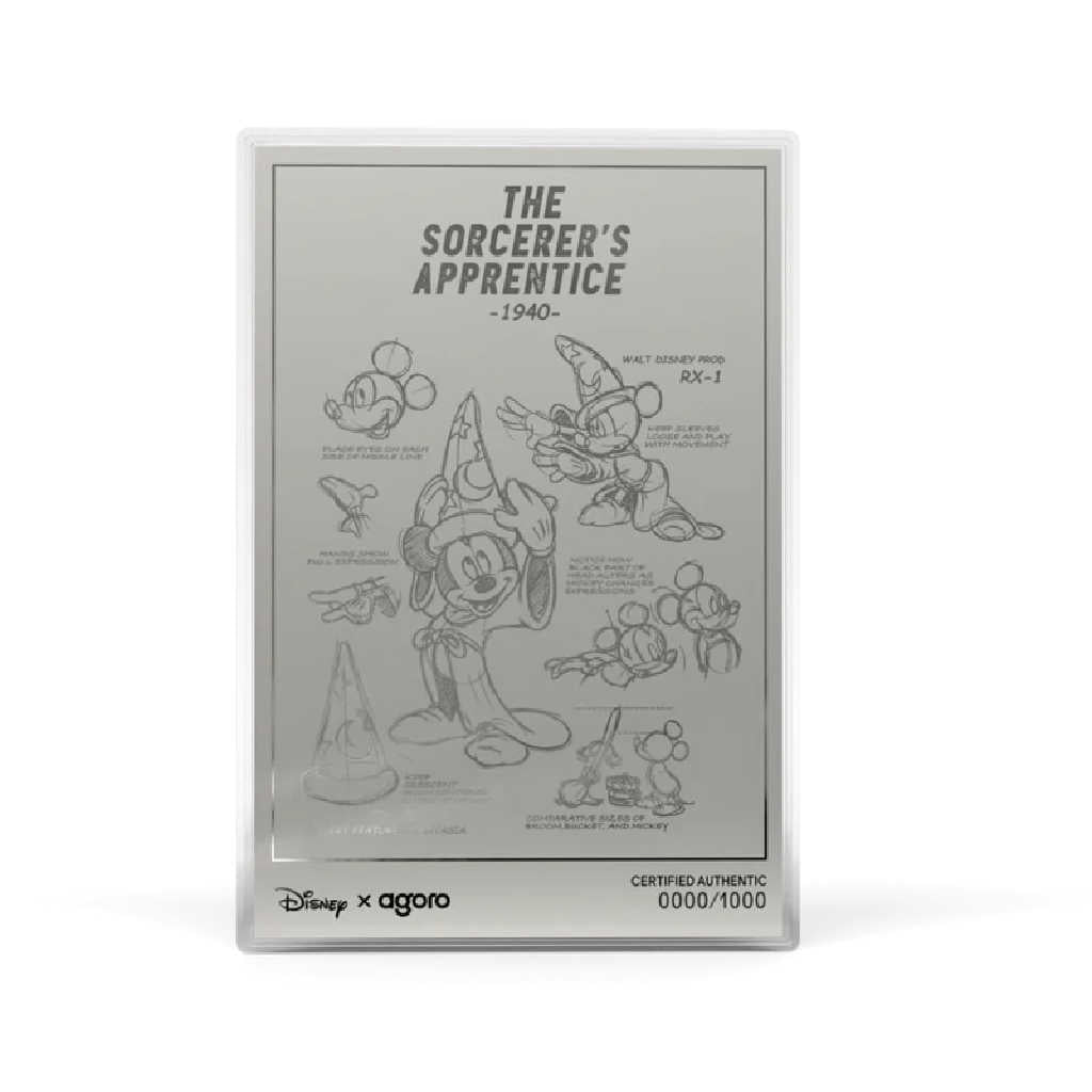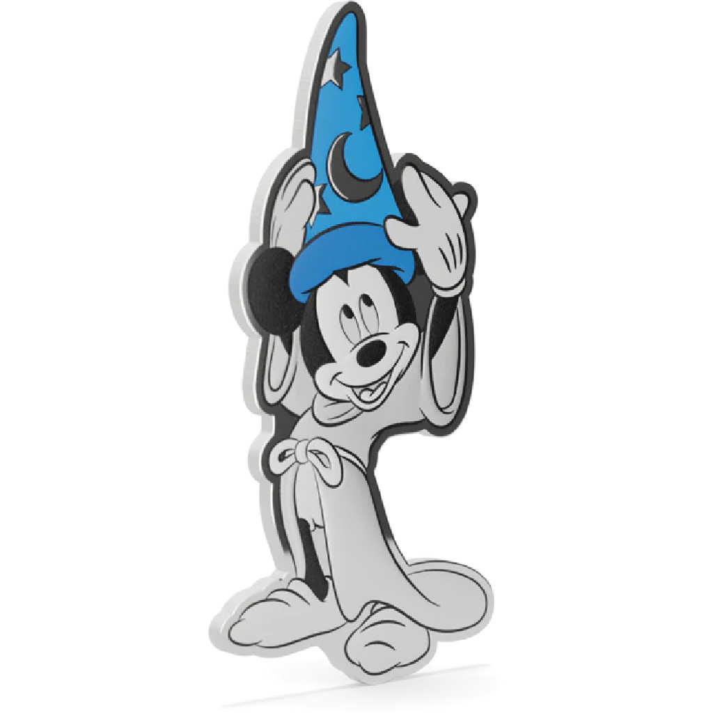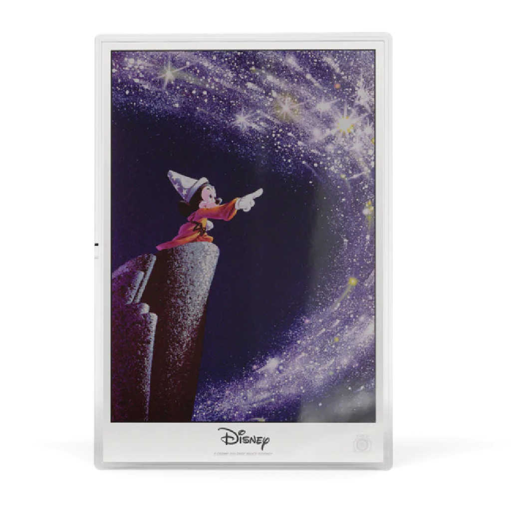 This special precious metal combo-style collectible includes a Sorcerer's Apprentice Mickey themed 1 oz .999 pure silver coin, along with a 5 gram .999 pure silver postcard foil, presented together in dual-display packaging. The silver coin measures 63 mm x 32 mm, and is struck in pure silver with color, frost, and proof-like detailing, capturing Sorcerer's Apprentice Mickey in a shining mirror finish with vintage black and white layering. His hat bursts in a bright blue, and is covered with a shining moon and stars. The Postcard Foil measures 149 mm x 100 mm, and features spellbinding artwork from Disney's Fantasia on a colorful silver postcard, adorned with Sorcerer's Apprentice Mickey concept art on the back. Both the coin and foil bear the Public Seal of Niue, confirming legal tender status. Each collectible is individually numbered on the back. Please note, while sold as a set, Foil and Coin numbers are not guaranteed to match. Limited worldwide mintage of just 1,000 pieces.