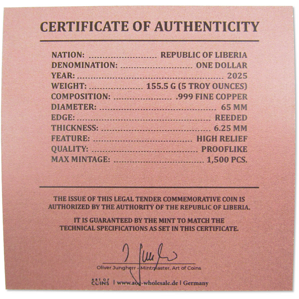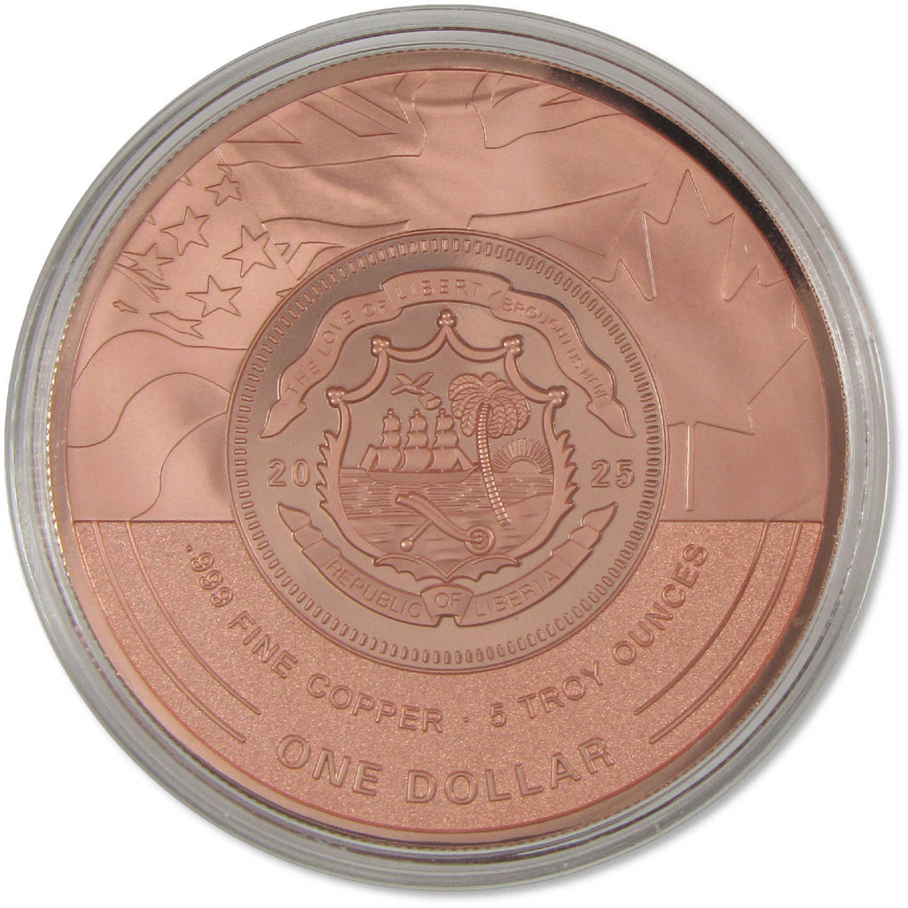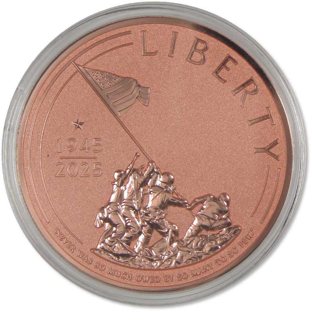 A genuine 2025 Liberia 80th Anniversary of the end of World War II Copper $1 Proof-Like Coin, from Art of Coins, in Uncirculated Mint State Condition. Contains 5 oz 0.999 Copper. Measuring 65 mm in diameter and 6.25 mm in thickness, this legal tender coin of the Republic of Liberia features a high-relief design depicting the American flag raising on Iwo Jima, recalling a pivotal battle leading to the ultimate Allied victory. The dual date of 1945-2025 sits to the left of the design along with British Prime Minister Winston Churchill's words "never was so much owed by so many to so few". Comes with the certificate of authenticity.