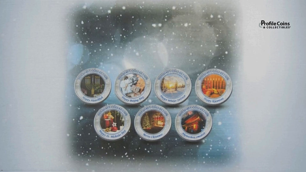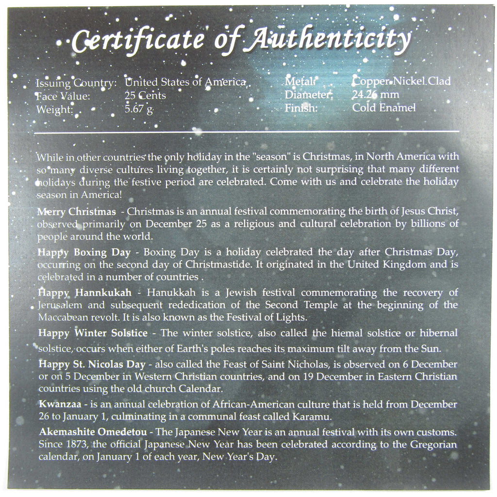 This beautiful collection features seven modern U.S. quarters colorized with designs celebrating different holidays that are celebrated during this festive time of the year: Christmas, Boxing Day, Hannkukah, Winter Solstice, St Nicolas Day, Kwanzaa and Akemashite Omedetou (Japanese New Year). Each quarter has been beautifully colorized with an enamel finish, and comes presented in a display case with a certificate of authenticity.