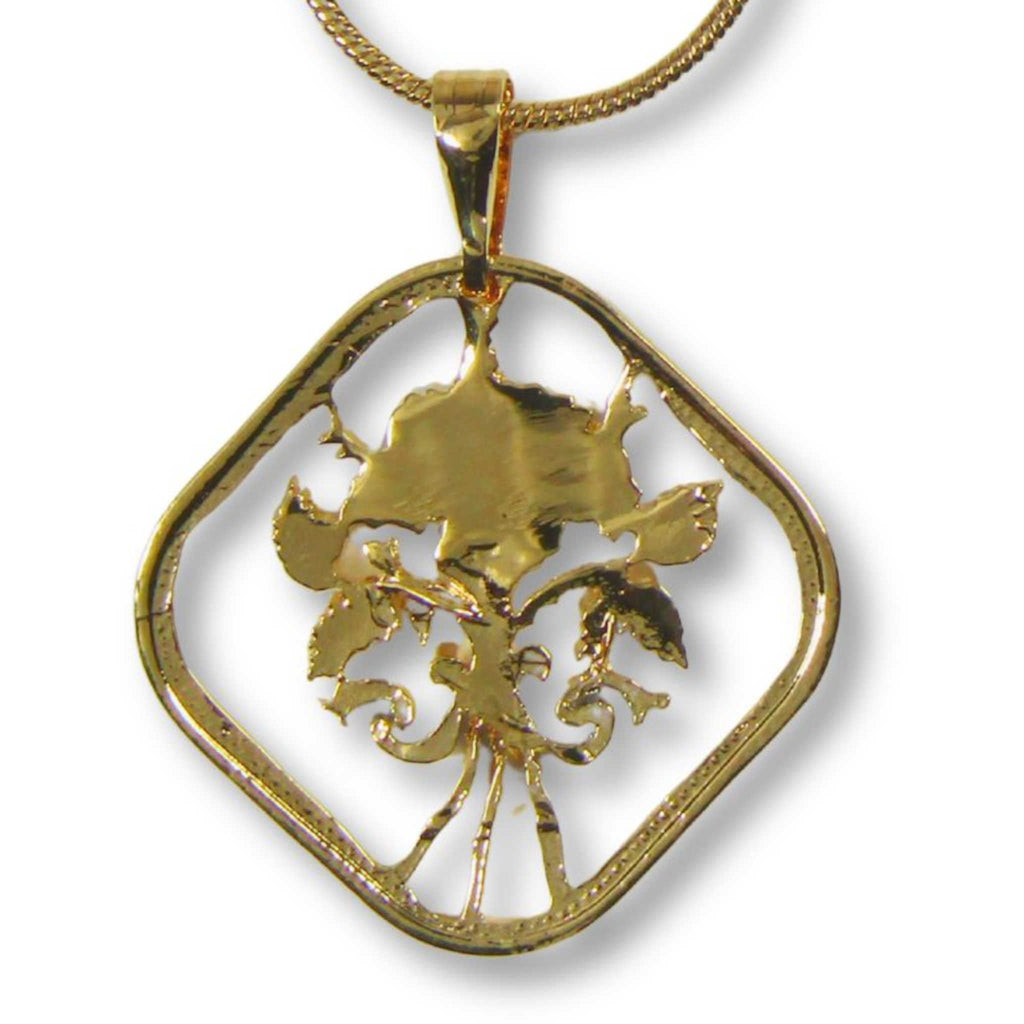 This beautifully detailed pendant is cast from a hand-cut 1966-1992 Bahamas 15 cent coin, and features a blooming hibiscus flower, a symbol of beauty, joy and luck. Each piece is layered in 14k gold, while the flower is highlighted in precious rhodium. Comes with a 20 inch gold-plated chain, and gift box.