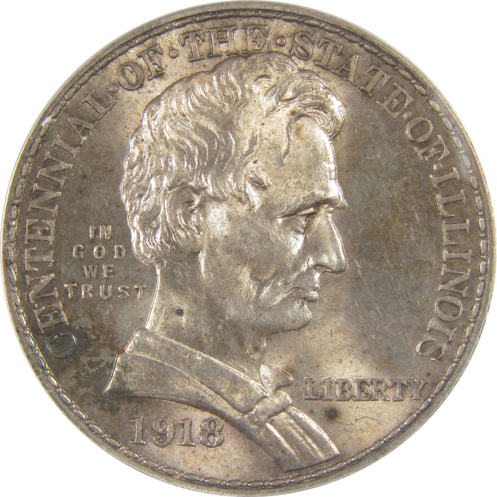 A genuine 1918 Lincoln Illinois Centennial Commemorative Silver Half Dollar Coin, graded and certified MS 63 by ANACS. Contains 90% Silver