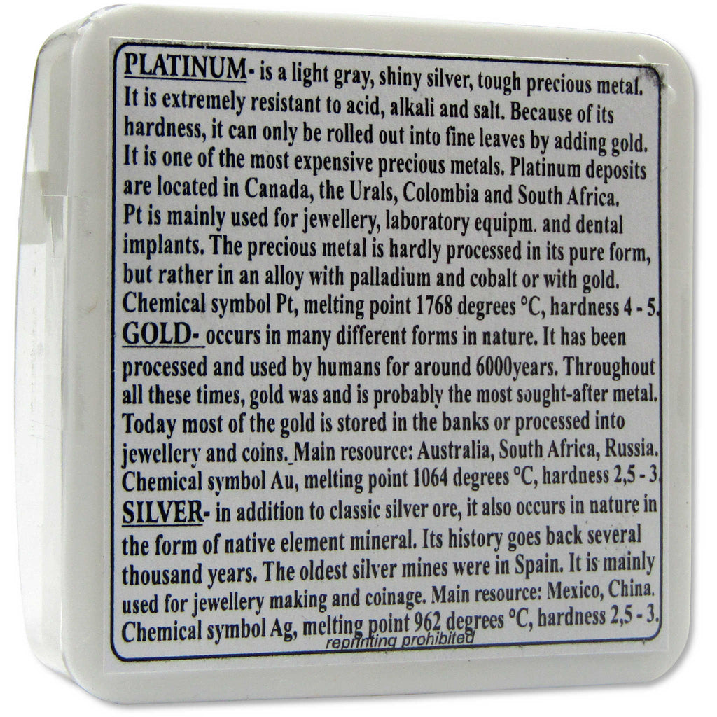 This set of three vials contains flakes of platinum, gold, and silver, suspended in glycerine, allowing them to float gently to the bottom each time the vials are turned. All three are presented together in a display box with an informative story card.