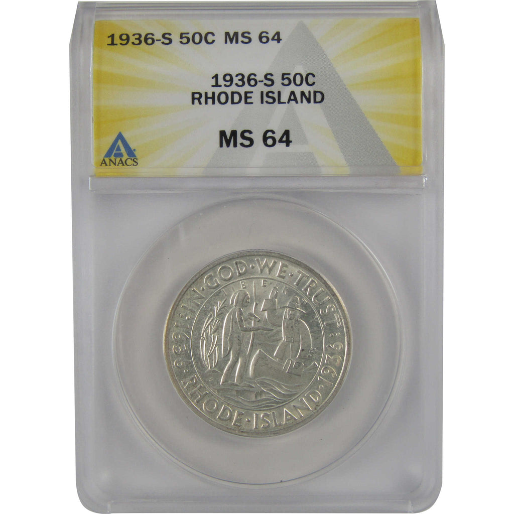 A genuine 1936 S Providence Rhode Island Tercentenary Commemorative Silver Half Dollar Coin, graded and certified MS 64 by ANACS. Contains 90% Silver