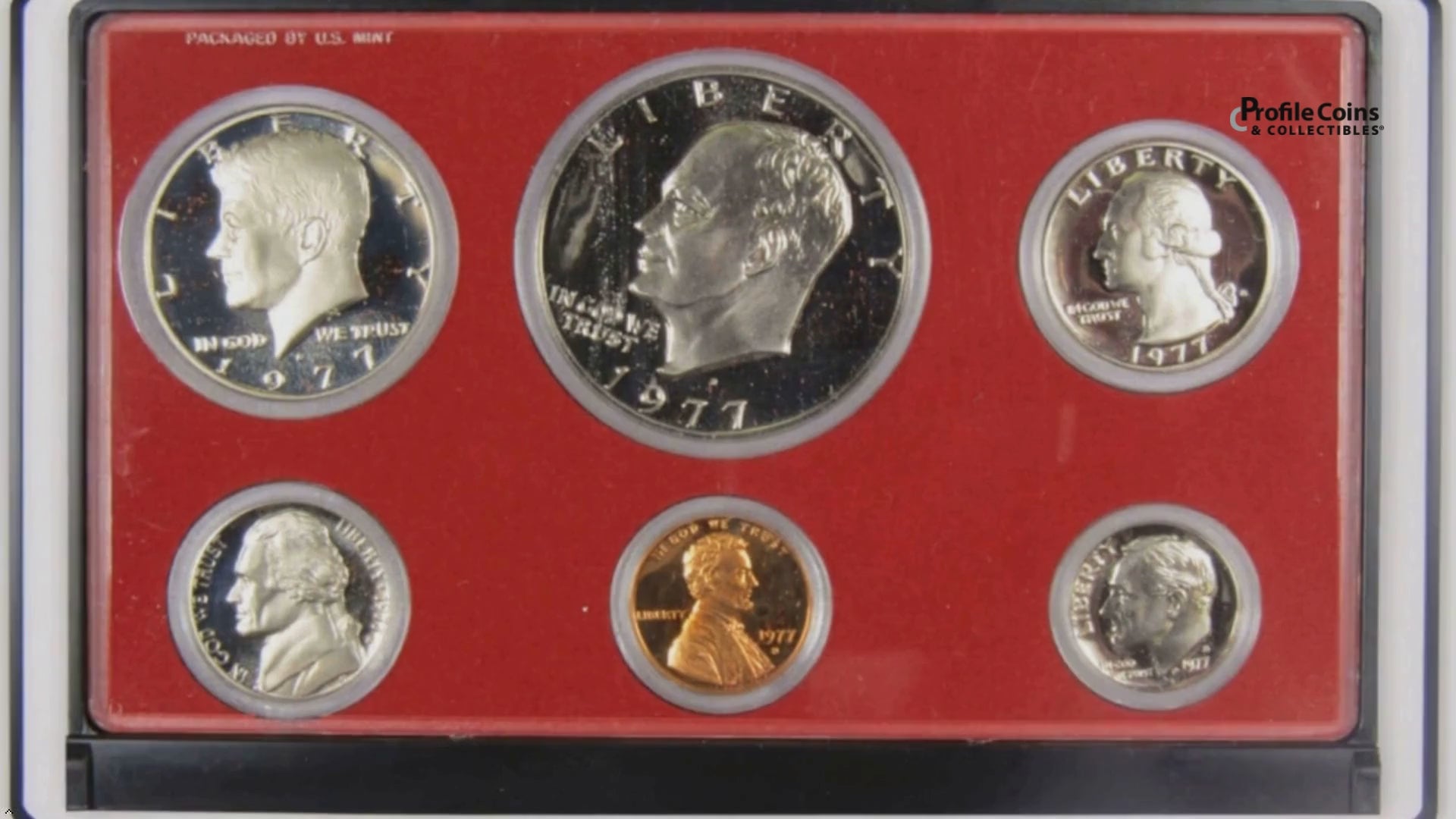 This official 1977 U.S. Mint 6 coin Proof Set contains a Eisenhower dollar, Kennedy half dollar, Washington quarter, Roosevelt dime, Jefferson nickel and Lincoln cent. All coins bear the San Francisco "S" mint mark, and feature extra sharp images and mirror-like surfaces. The dollar, half dollar, quarter and dime are all copper-nickel clad. Comes with the original U.S. Mint packaging. Please note that Proof Sets prior to 1990 did not include a certificate of authenticity.