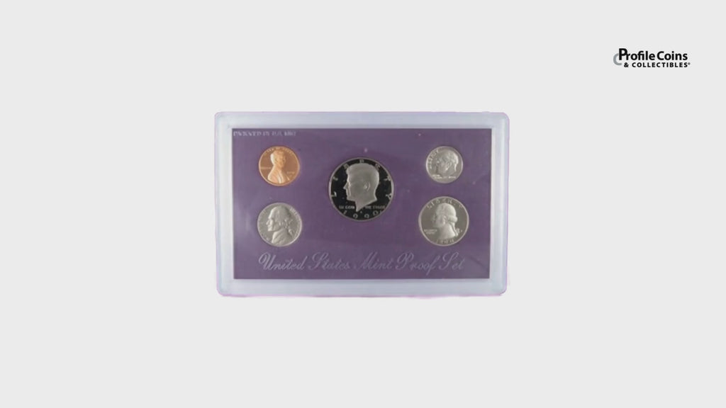 This official 1990 U.S. Mint 5 coin Proof Set contains a Kennedy half dollar, Washington quarter, Roosevelt dime, Jefferson nickel and Lincoln cent. All coins bear the San Francisco "S" mint mark, and feature extra sharp images and mirror-like surfaces. The half dollar, quarter and dime are all copper-nickel clad. Comes with the original U.S. Mint packaging, including a certificate of authenticity.