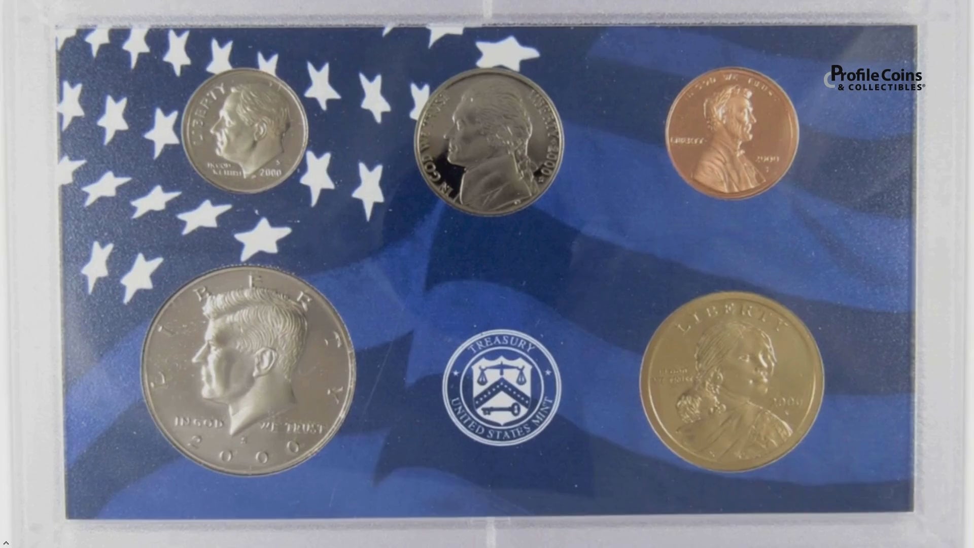 This official 2000 U.S. Mint 10 coin Proof Set contains a Sacagawea dollar, Kennedy half dollar, Roosevelt dime, Jefferson nickel and Lincoln cent, along with all five Statehood quarters. All coins bear the San Francisco "S" mint mark, and feature extra sharp images and mirror-like surfaces. The half dollar, quarters and dime are all copper-nickel clad. Comes with the original U.S. Mint packaging, including a certificate of authenticity.