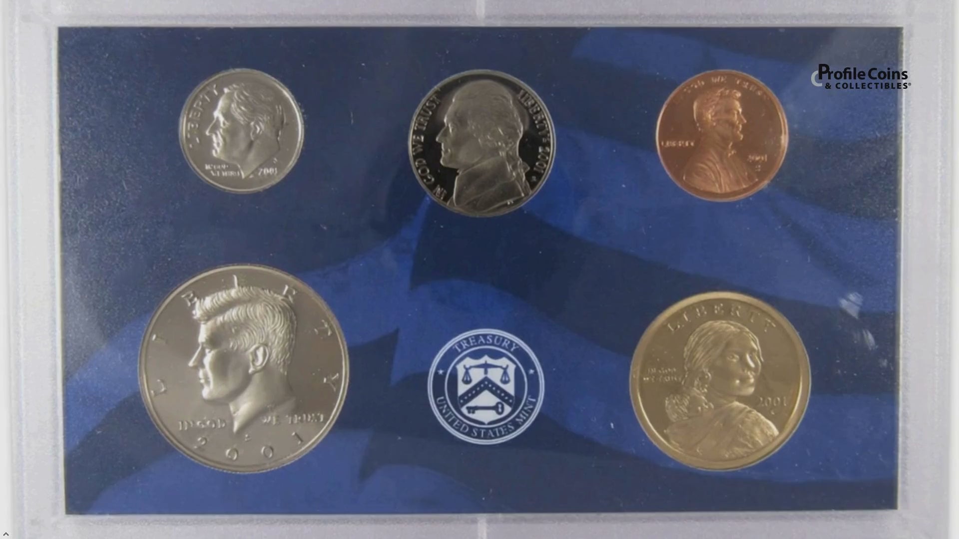 This official 2001 U.S. Mint 10 coin Proof Set contains a Sacagawea dollar, Kennedy half dollar, Roosevelt dime, Jefferson nickel and Lincoln cent, along with all five Statehood quarters. All coins bear the San Francisco "S" mint mark, and feature extra sharp images and mirror-like surfaces. The half dollar, quarters and dime are all copper-nickel clad. Comes with the original U.S. Mint packaging, including a certificate of authenticity.