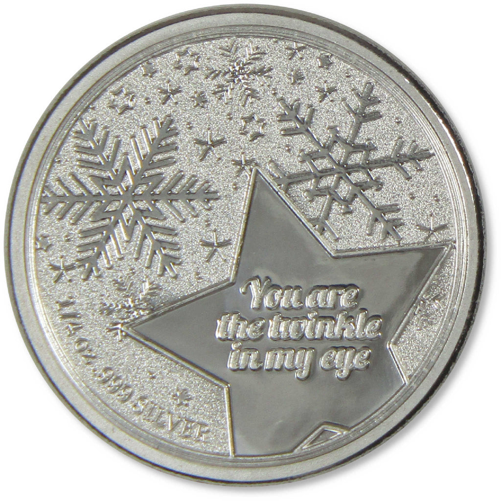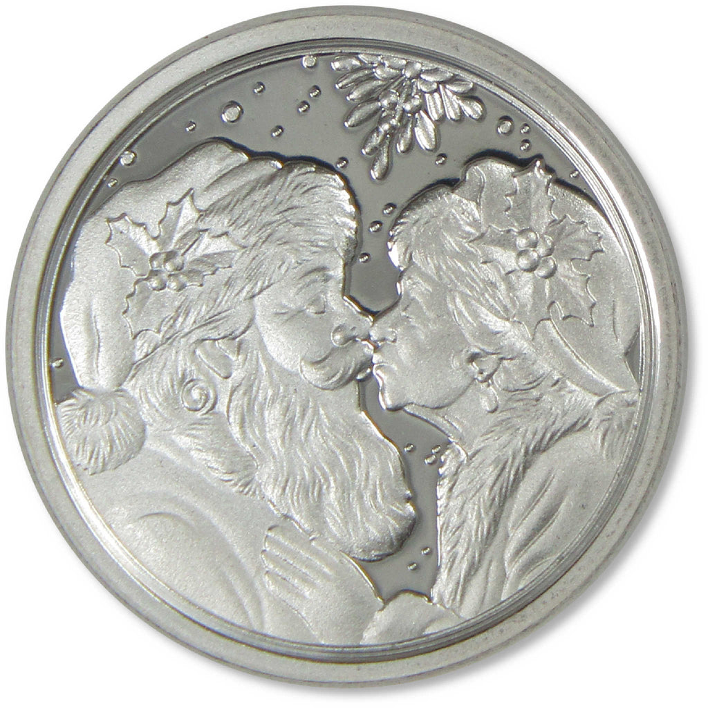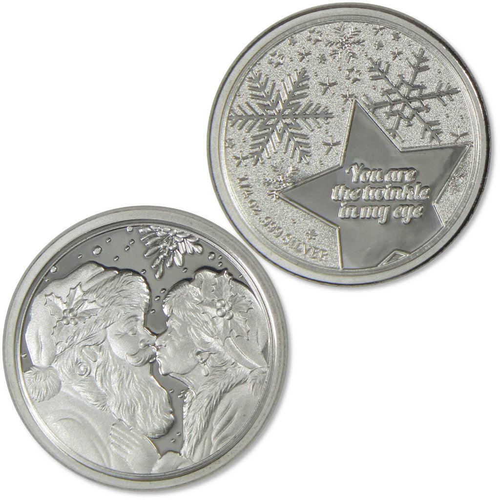 This 1/4 oz .999 fine silver round measures 0.75 inches in diameter, and depicts a tender moment between Santa Claus and Mrs. Claus as they share North Pole kisses. The reverse side features the touching message "You are the twinkle in my eye" along with the silver weight and purity.