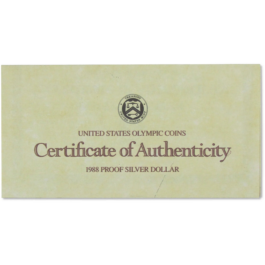 A genuine 1988 S Seoul Olympiad Commemorative Silver Dollar Proof Coin. Contains 90% Silver. Comes with the original government packaging, including a certificate of authenticity