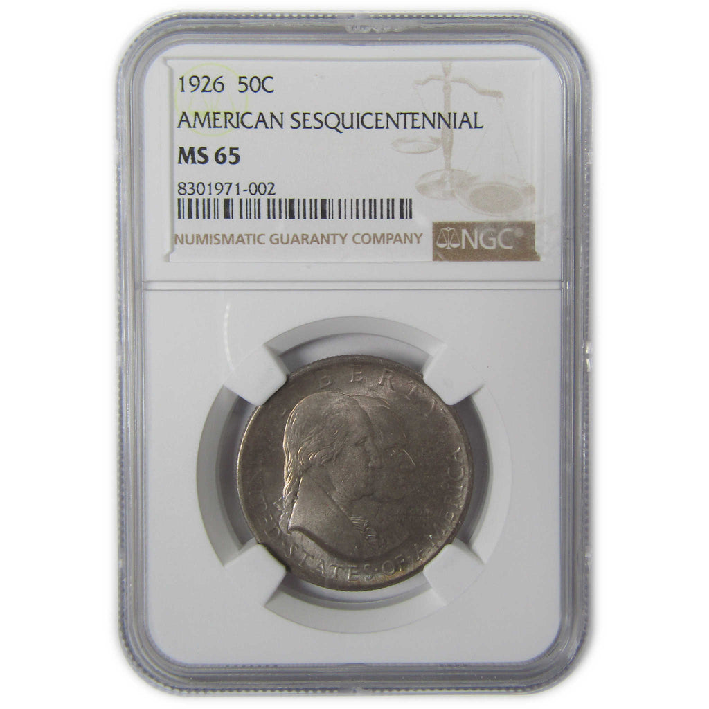 A genuine 1926 Sesquicentennial of American Independence Commemorative Silver Half Dollar Coin, graded and certified MS 65 by NGC. Contains 90% Silver