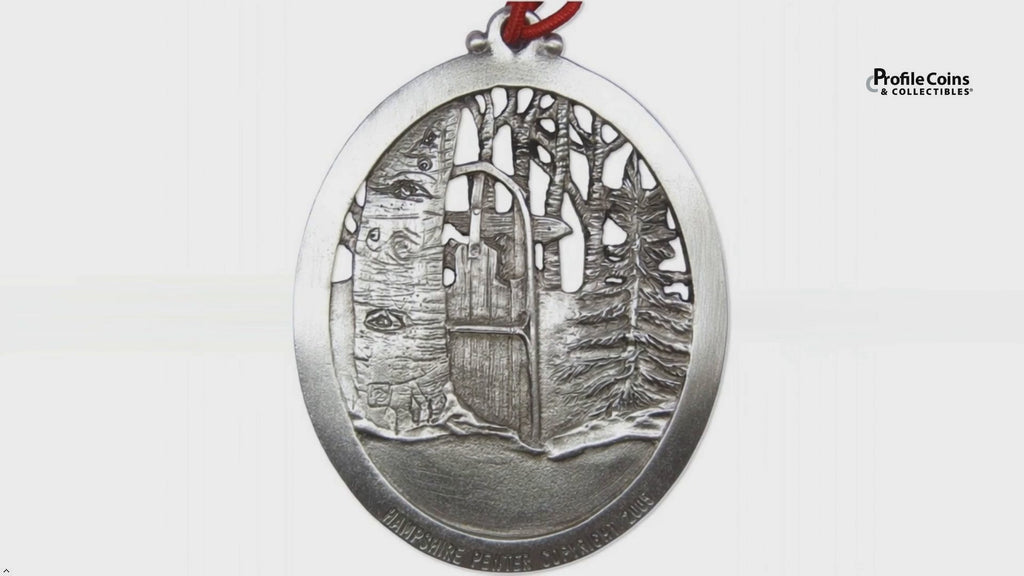 This elegant pewter Christmas tree ornament was crafted in New Hampshire, and features a festive design captured in full detail on both sides. Each comes with a ribbon for hanging.