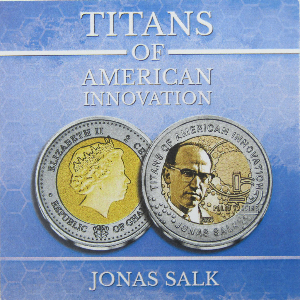 A genuine 2021 Ghana Titans of American Innovation: Jonas Salk Titanium 2 Cedis Coin, in Uncirculated Mint State Condition. Measures 30 mm in diameter, weighs 15 grams, and contains 0.99 Titanium. Comes with the certificate of authenticity, but no other original packaging